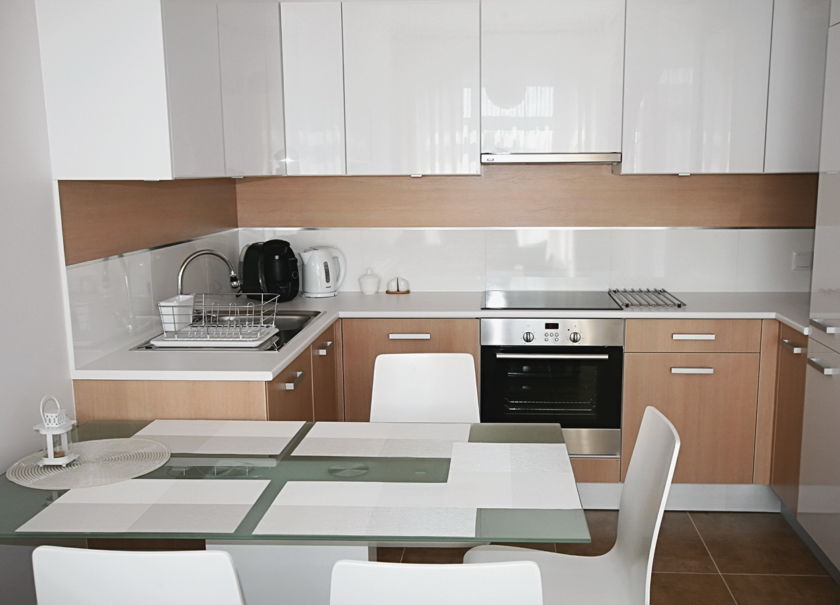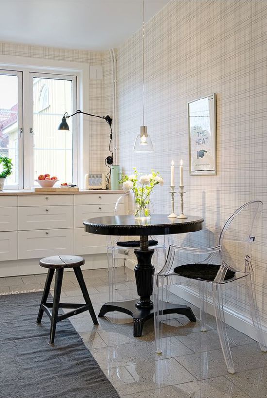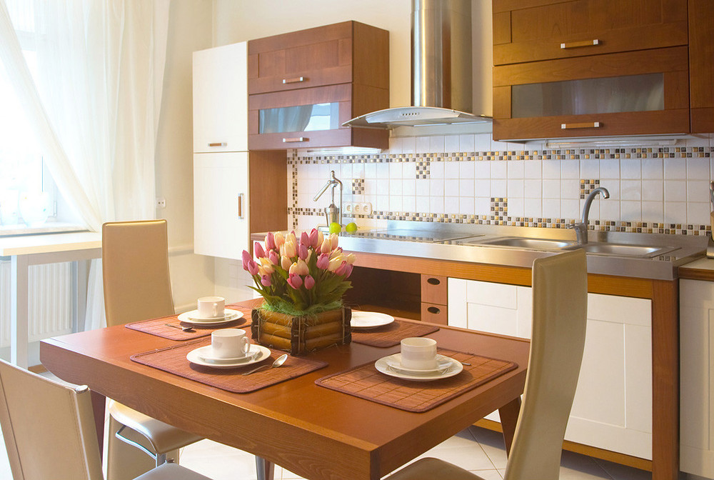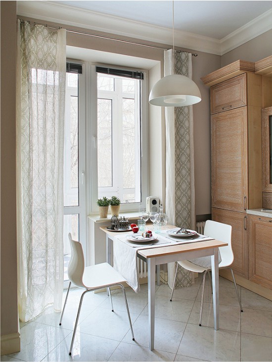 Pour une petite surface de la cuisine, les tables transformateurs, avec fixation au mur ou sur une petite base, ainsi que le verre trempé, qui prennent visuellement moins d'espace, créent l'illusion de légèreté et d'apesanteur de l'intérieur. Il vaut la peine de choisir une table rectangulaire et de laisser les tables ovales et rondes pour des pièces plus spacieuses.