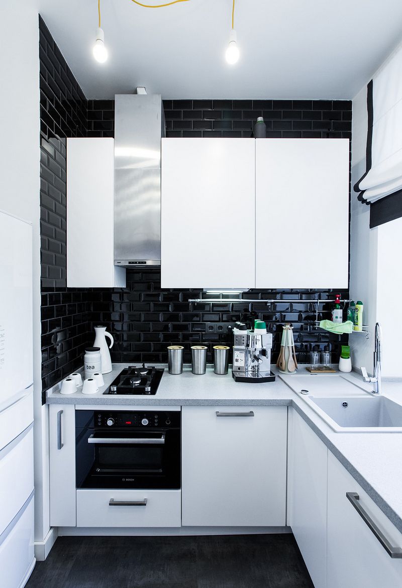 - Couleurs noir et blanc - une excellente option pour une cuisine dans le style du minimalisme. Le décor est très simple à choisir, l'intérieur n'est pas surchargé d'éléments et d'accessoires inutiles.
