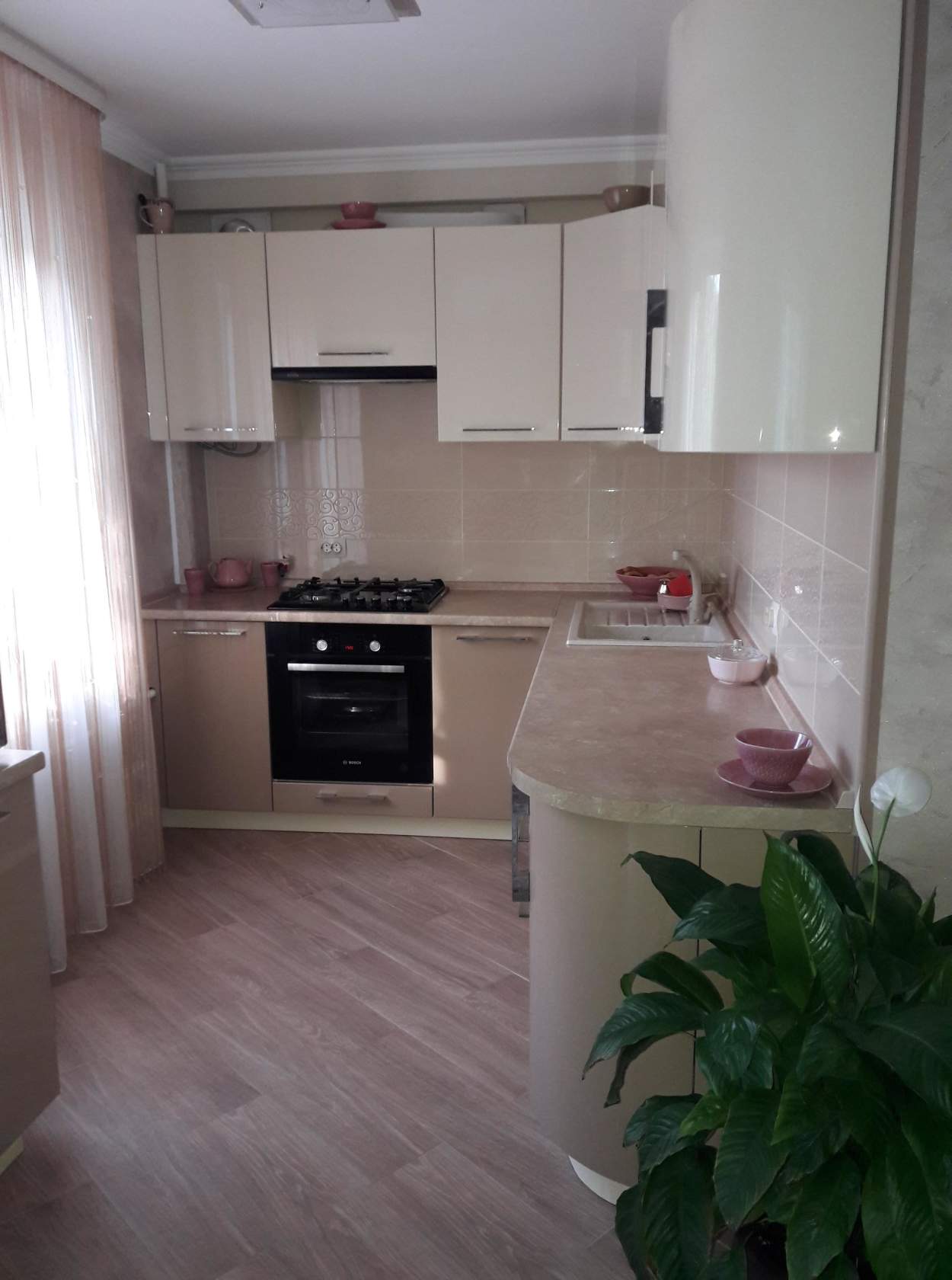 - La cuisine à Odnushka a l'air très confortable, décorée dans des tons beiges avec des accents brun foncé. C'est un vrai classique et convient à n'importe quelle zone de la pièce.
