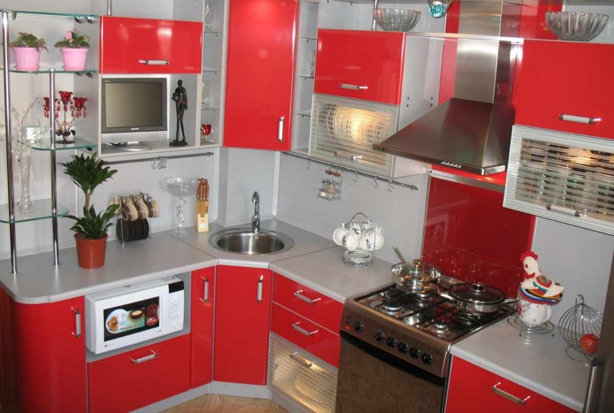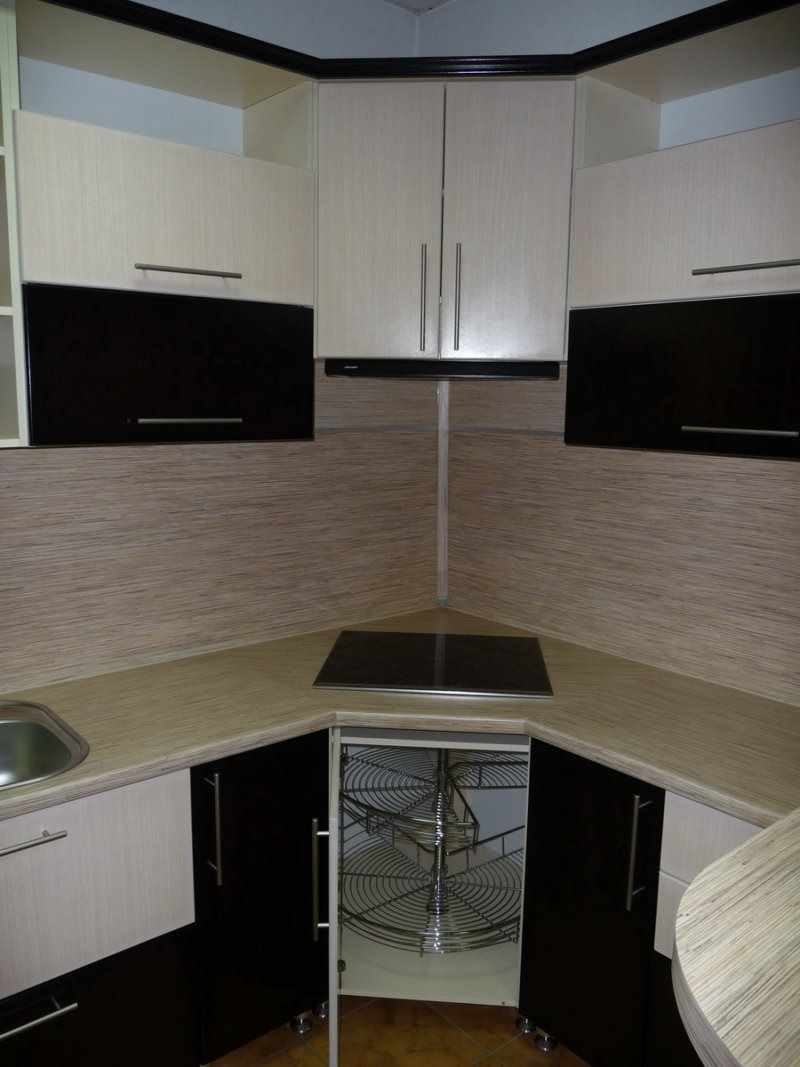 Astuce. Essayez au lieu d'armoires murales dans le coin d'installer des étagères ouvertes à plusieurs niveaux avec des spots. Selon l'intérieur général, les étagères peuvent être en bois, en verre ou en aluminium. Une telle décision ajoutera des éléments de décoration supplémentaires à l'intérieur global de la cuisine.