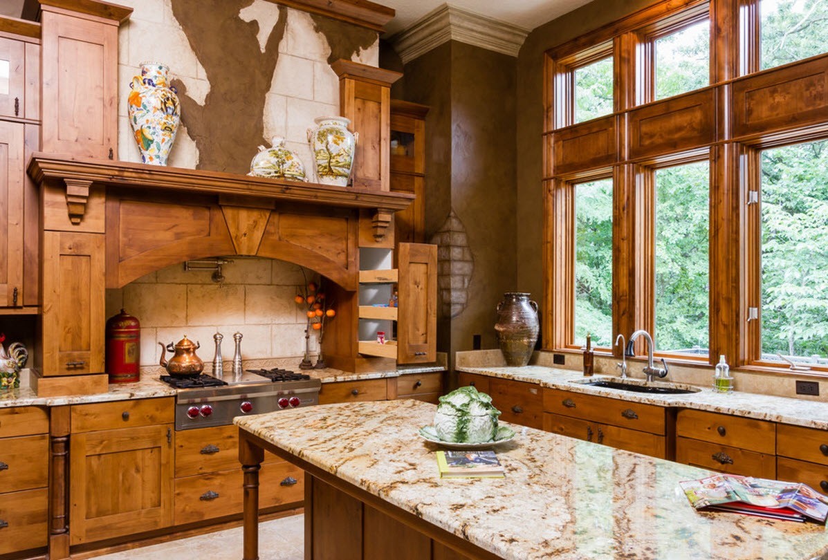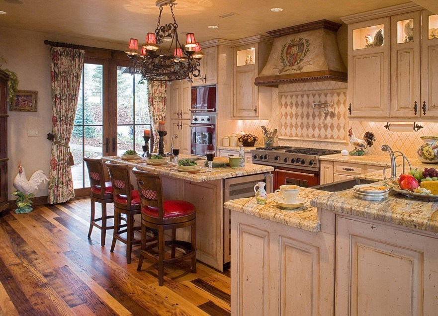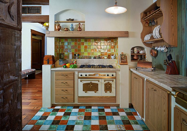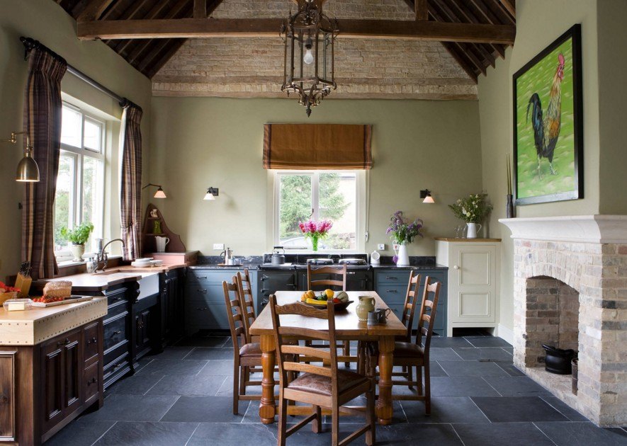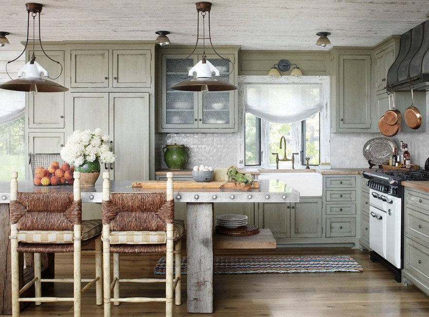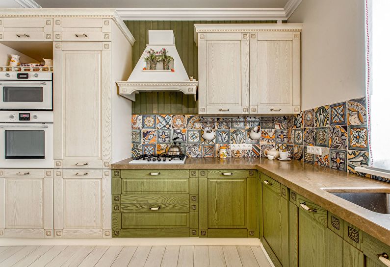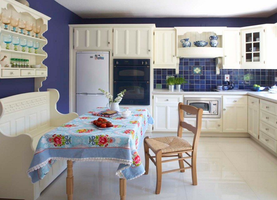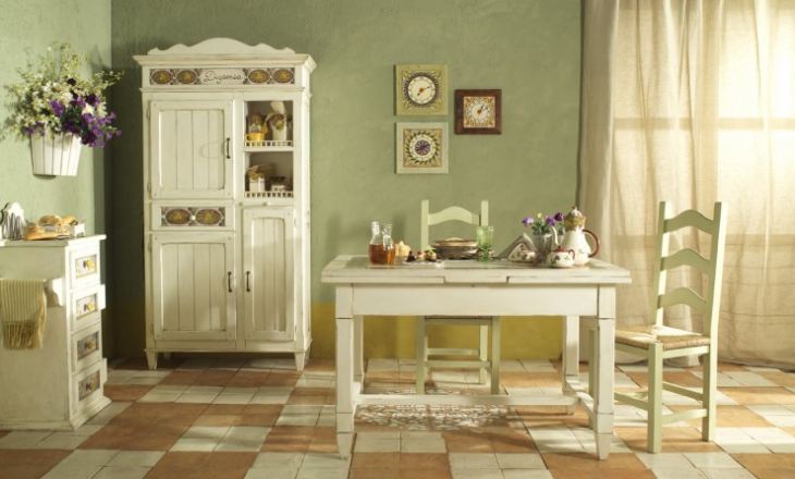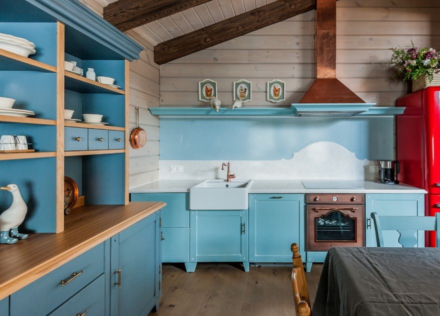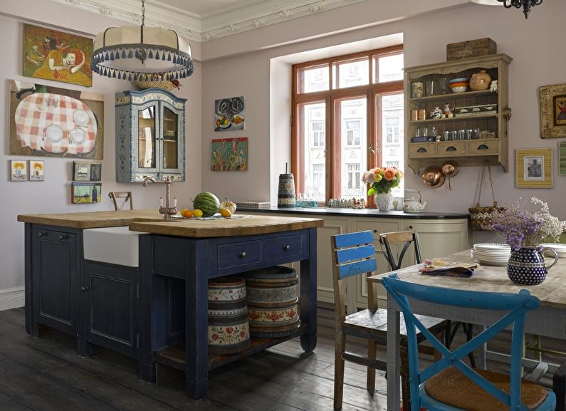 La cuisine rustique ne tolère pas l'utilisation de couleurs vives et flashy - rose, bleu vif, jaune vénéneux, écarlate, etc.