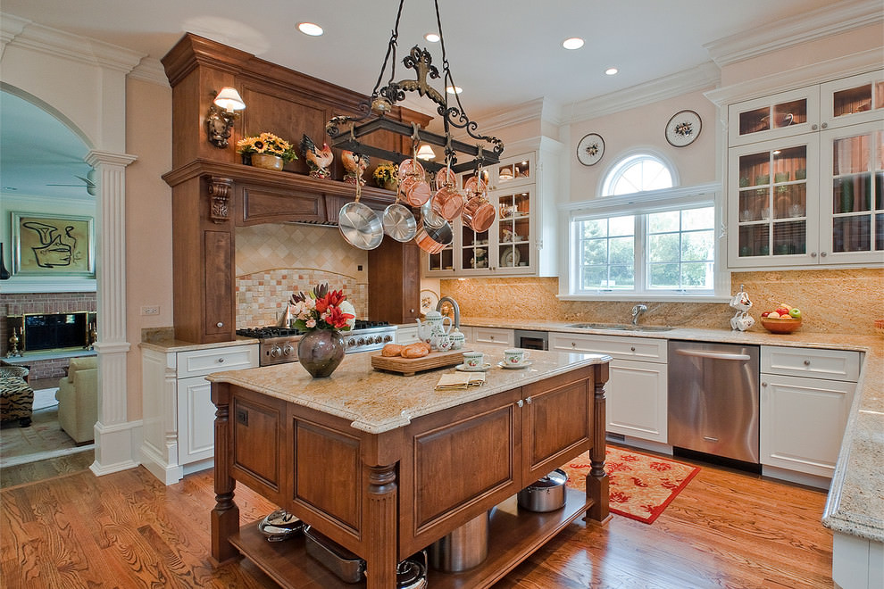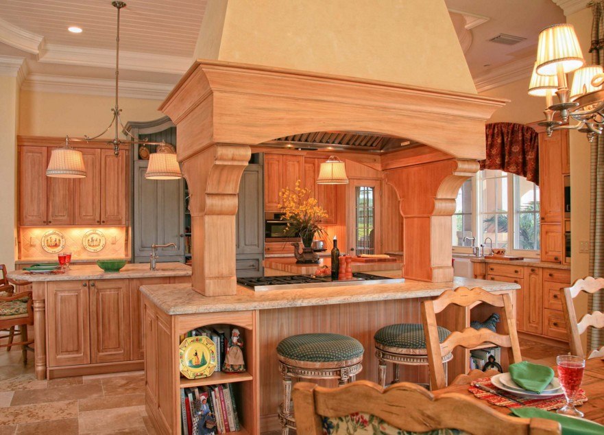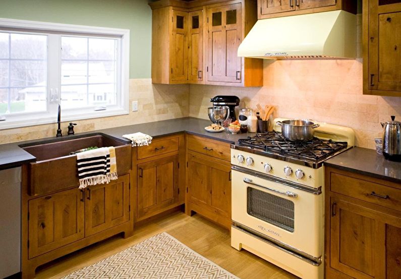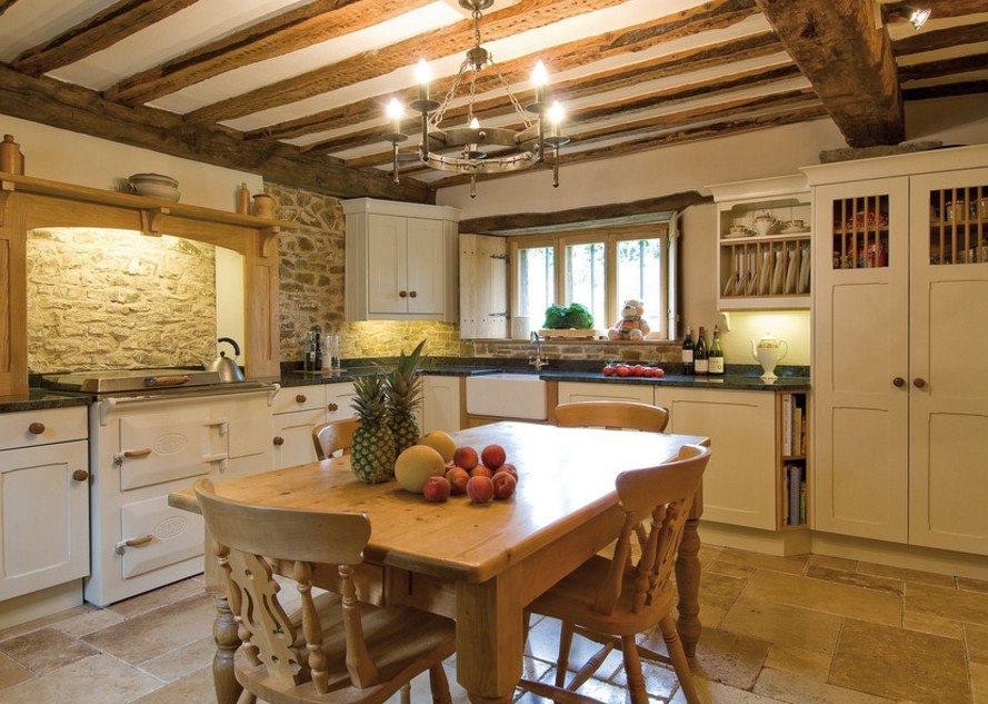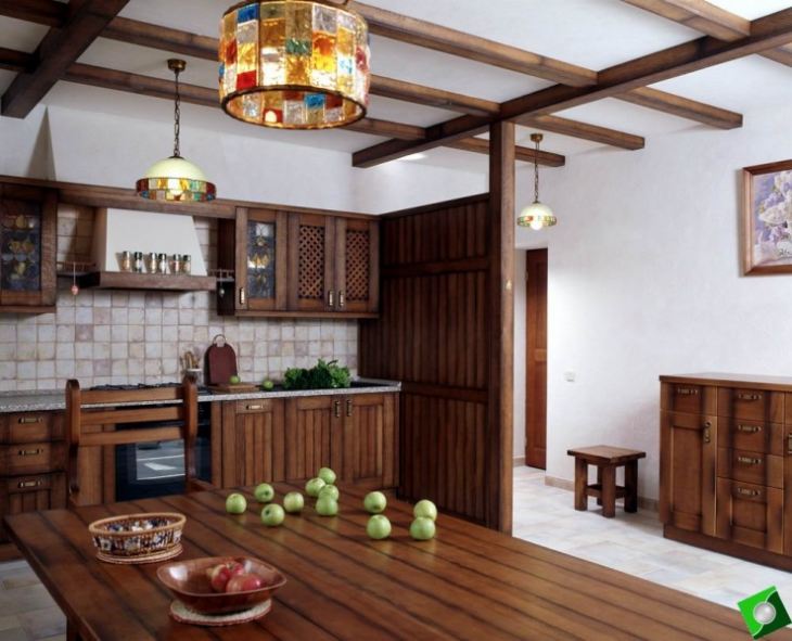 L'un des éléments traditionnels peut être appelé poutres de plafond. Si la cuisine est décorée dans un pays américain ou anglais, les poutres doivent être de couleurs sombres. Pour un pays français plus clair, vous pouvez utiliser des couleurs claires.