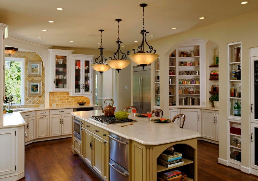 Pour les grandes cuisines, qui sont divisées en zones, il est permis d'utiliser plusieurs lampes fabriquées dans le même sens. Ils peuvent être situés sur une seule ligne au-dessus de la table à manger. Un éclairage supplémentaire de la zone de travail peut être obtenu grâce à l'utilisation de projecteurs.
