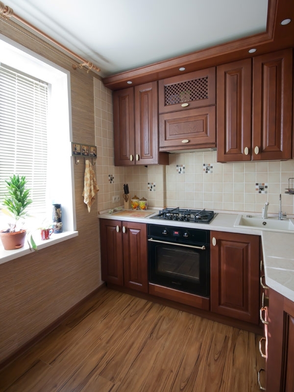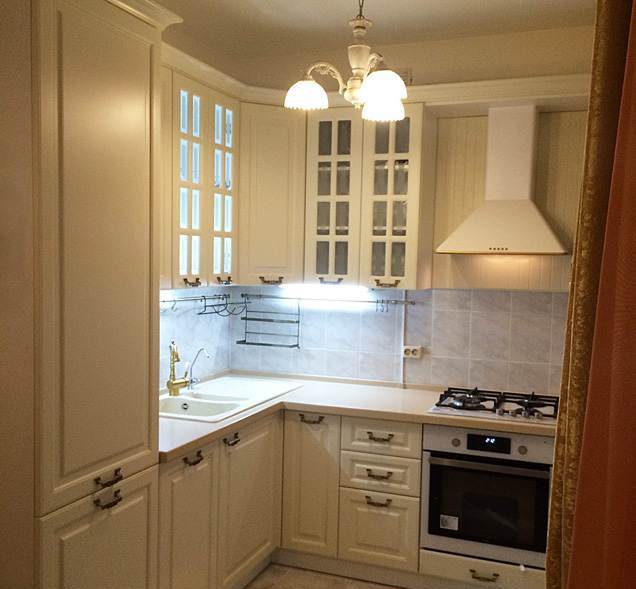 Le classique n'est pas la meilleure solution pour les petites cuisines. Ce style nécessite beaucoup d'espace. Cependant, il peut être mis en œuvre en combinant l'espace cuisine avec le salon à Khrouchtchev.