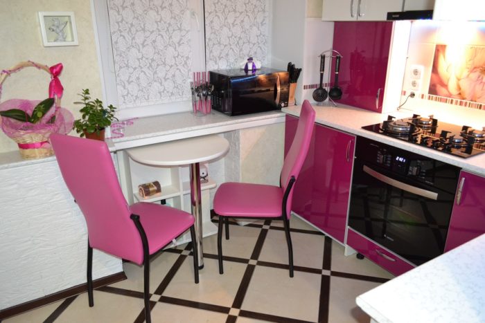 Lors du choix d'une table à manger, vous devez faire attention à sa forme. Les formes rectangulaires et carrées standard à Khrouchtchev ne seront pas appropriées. Il vaut mieux acheter une table de forme ovale, l'installer près d'un des murs. Une bonne solution consiste à acheter un produit en verre. Un tel meuble crée l'effet d'apesanteur, il se dissout pratiquement sur le fond des murs clairs. Des chaises compactes seront nécessaires pour la table. N'achetez pas d'articles encombrants. Il vaut mieux privilégier les chaises basses sans dossier. Parfois, une table à manger classique peut être remplacée par un comptoir de bar. C'est une excellente solution pour les styles modernes! Un casque fonctionnel, une table, des chaises suffisent. Les meubles en excès ne feront que nuire à l'intérieur.
