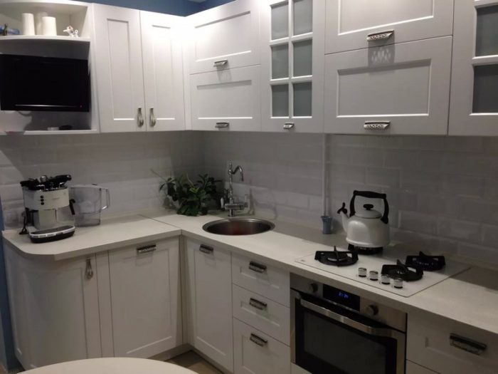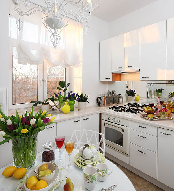 - Décoration murale en blanc. Les murs n'ont pas besoin d'être décorés avec des dessins, des ornements. Leur décoration doit être légère, aussi simple que possible. Les papiers peints lavables sont parfaits. Dans la zone du tablier, vous pouvez utiliser une mosaïque en céramique.