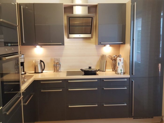 Le casque doit inclure la possibilité d'intégrer la technologie. Un réfrigérateur, un four, caché derrière les façades, feront de l'intérieur. Dans la zone de travail, un plan de travail en pierre de couleur claire aura un aspect idéal. Un comptoir en pierre artificielle présente de nombreux avantages. Il est difficile de laisser des rayures dessus, le matériau dure longtemps, ne cause pas de difficultés dans le processus de nettoyage.Économiser des mètres carrés aidera au choix des mécanismes rétractables. Les meubles transformateurs vous permettent de placer tous les ustensiles nécessaires de manière compacte.