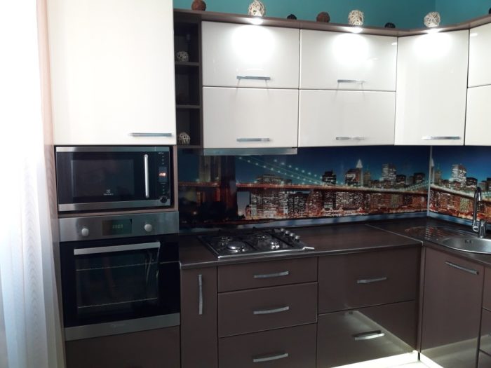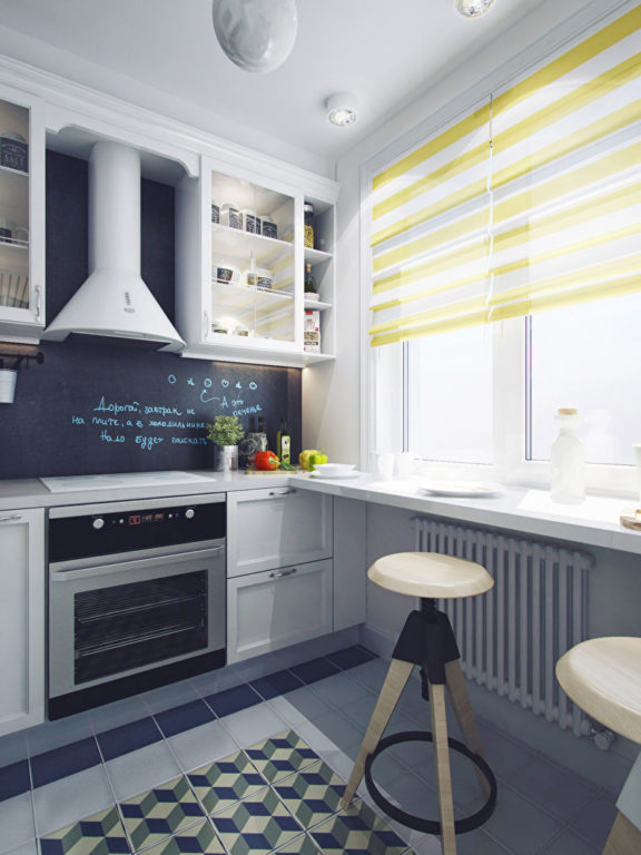 Vous pouvez ajouter de la couleur au décor avec un petit motif coloré. Un motif fin peut décorer la surface à manger, la zone de travail d'un petit espace. Grand motif, grandes formes géométriques, les dessins ne peuvent pas être utilisés. Les éléments avec des motifs ne devraient pas être nombreux. Vous pouvez répéter le motif sur les textiles de cuisine, les rideaux.