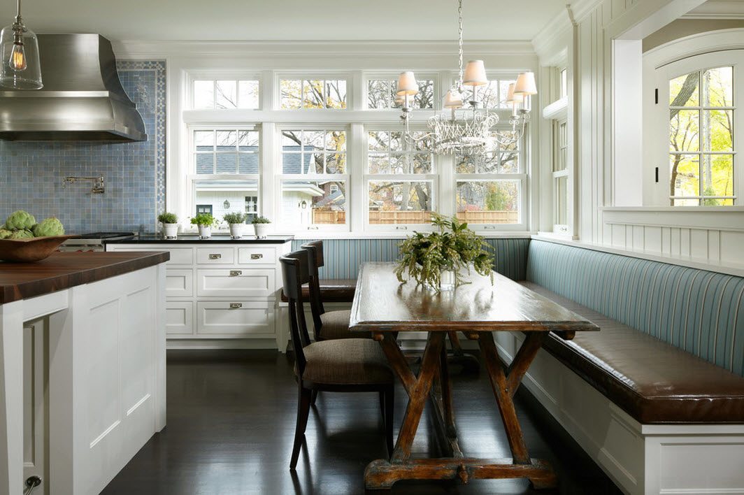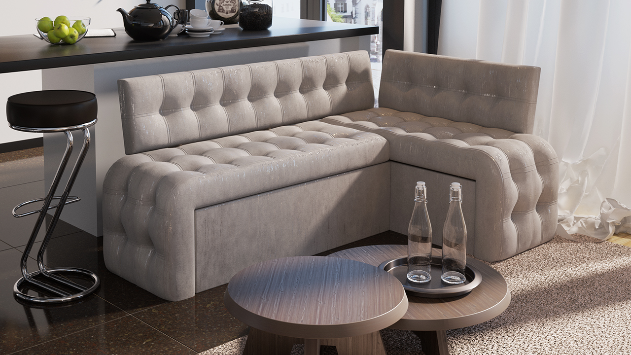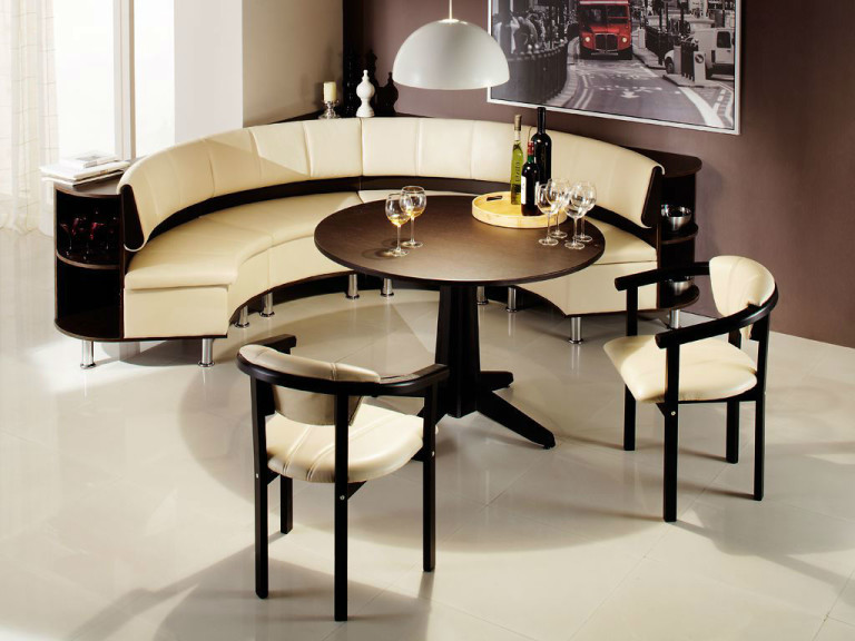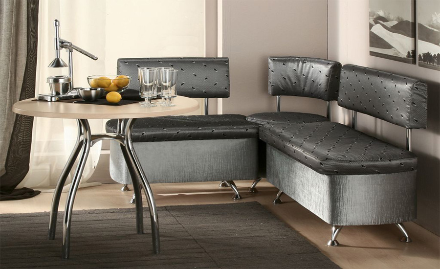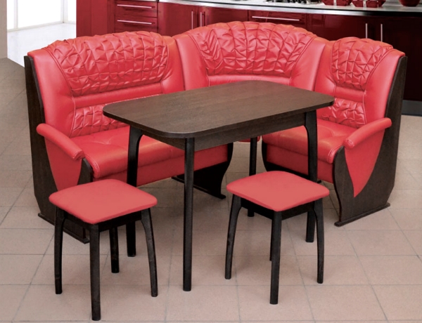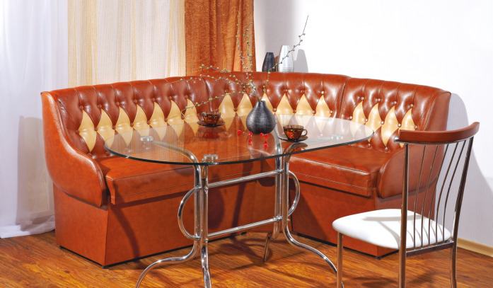 Du canapé! C'est l'élément principal, c'est à droite, à gauche ou universel. Un canapé d'angle doux, un banc direct avec des dossiers et des sièges amovibles pour une cuisine simple conviennent mieux à la salle à manger. Les meilleurs matériaux de rembourrage sont le daim, le cuir artificiel et d'autres tissus synthétiques, tels que la microfibre et le flocage. Pour les pièces spacieuses, les coins canapés avec accoudoirs, sur lesquels vous pouvez poser un verre ou une tasse, conviennent très bien.
