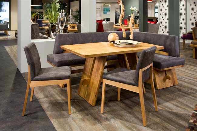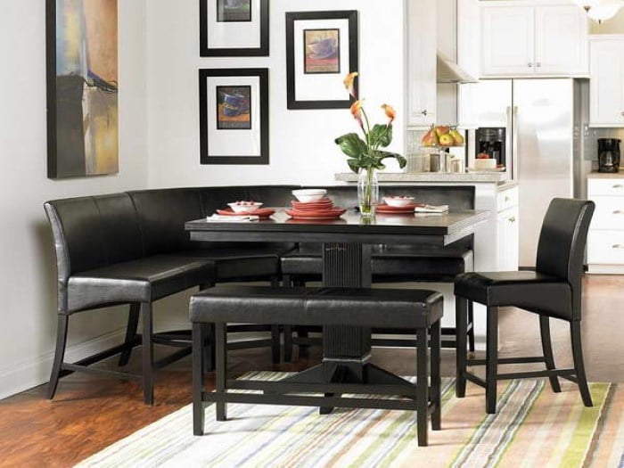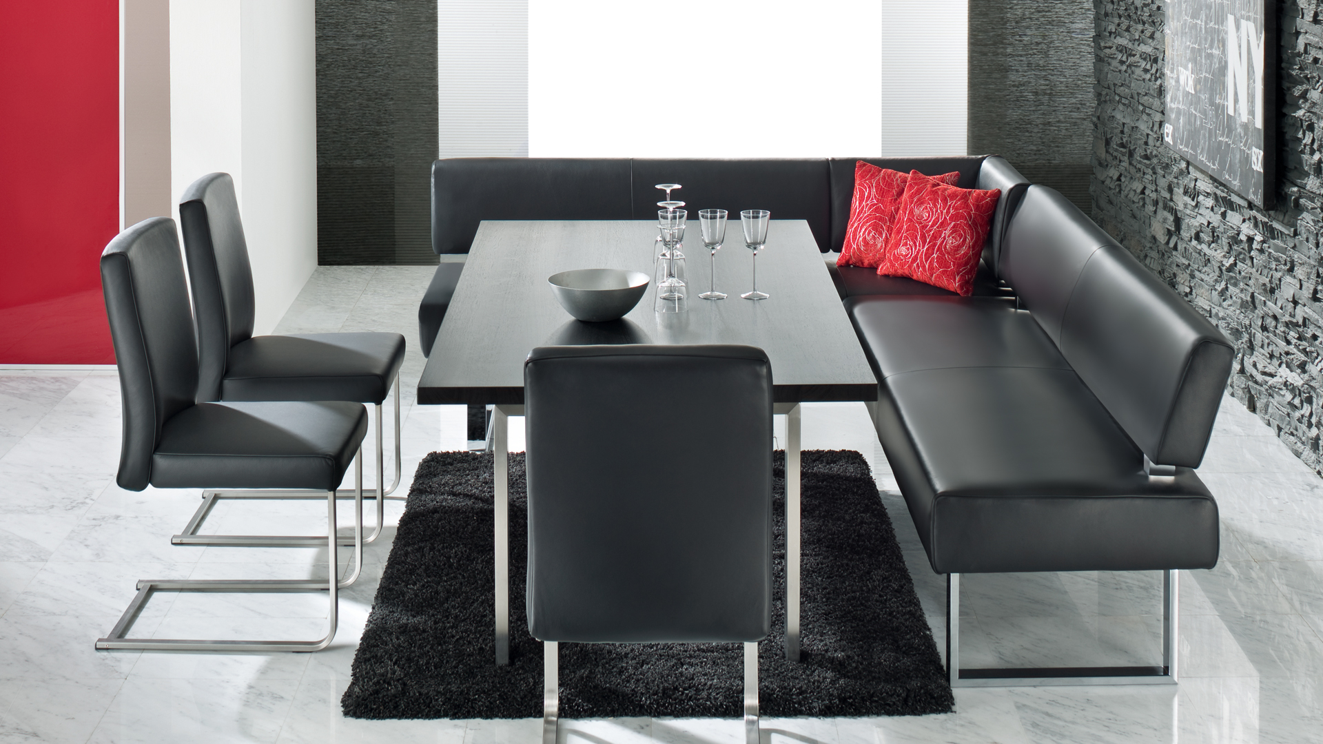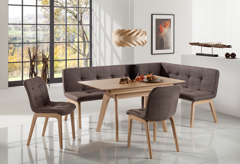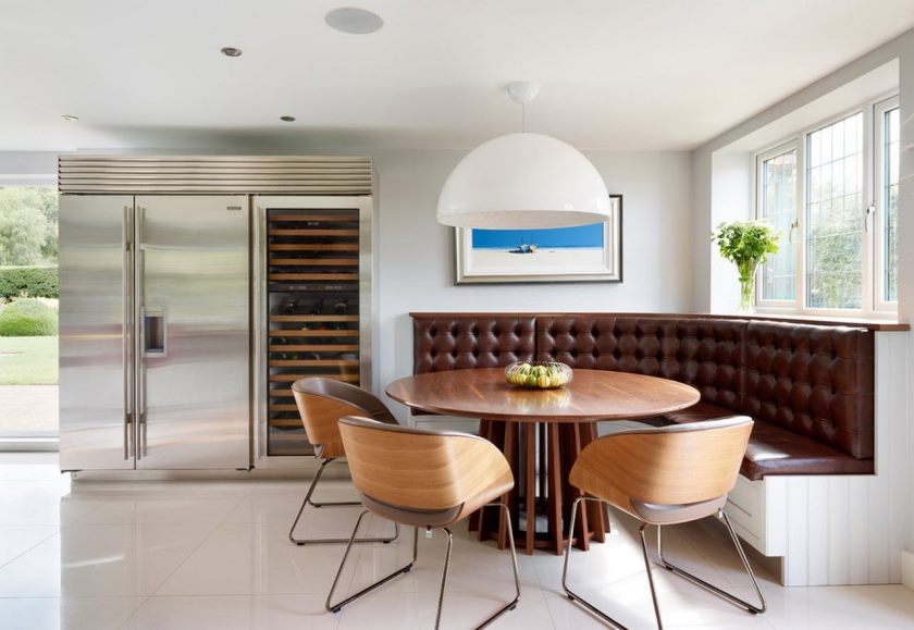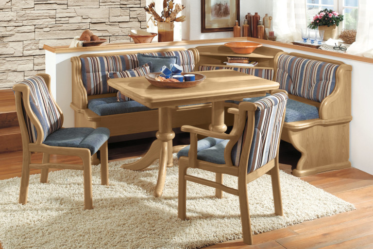 Du canapé! C'est l'élément principal, c'est à droite, à gauche ou universel. Un canapé d'angle doux, un banc direct avec des dossiers et des sièges amovibles pour une cuisine simple conviennent mieux à la salle à manger. Les meilleurs matériaux de rembourrage sont le daim, le cuir artificiel et d'autres tissus synthétiques, tels que la microfibre et le flocage. Pour les pièces spacieuses, les coins canapés avec accoudoirs, sur lesquels vous pouvez poser un verre ou une tasse, conviennent très bien.