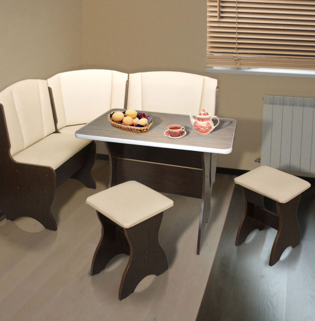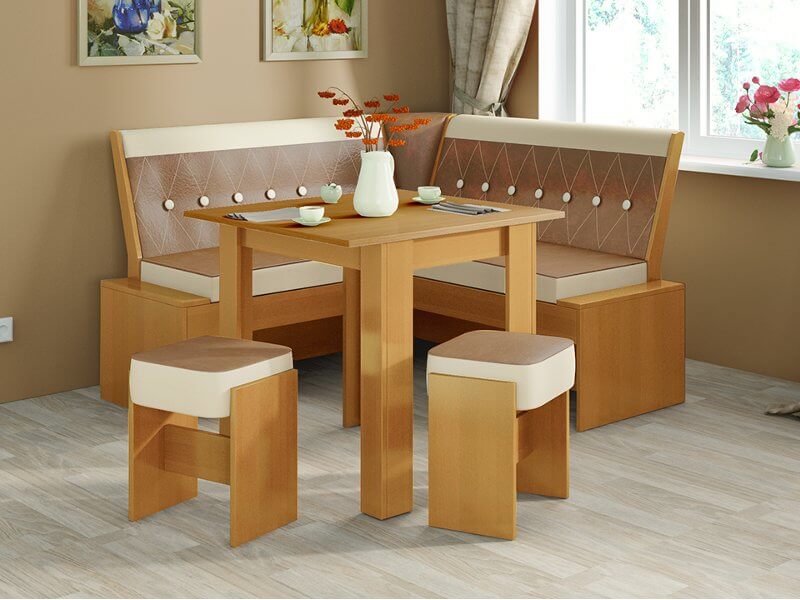 Presque chaque ensemble de coins doux dans la cuisine comprend un canapé, une table, des tabourets ou des chaises moelleux. De plus, vous pouvez toujours acheter des tabourets rembourrés et des oreillers décoratifs. Les kits peuvent être d'une seule pièce ou avec des tiroirs.