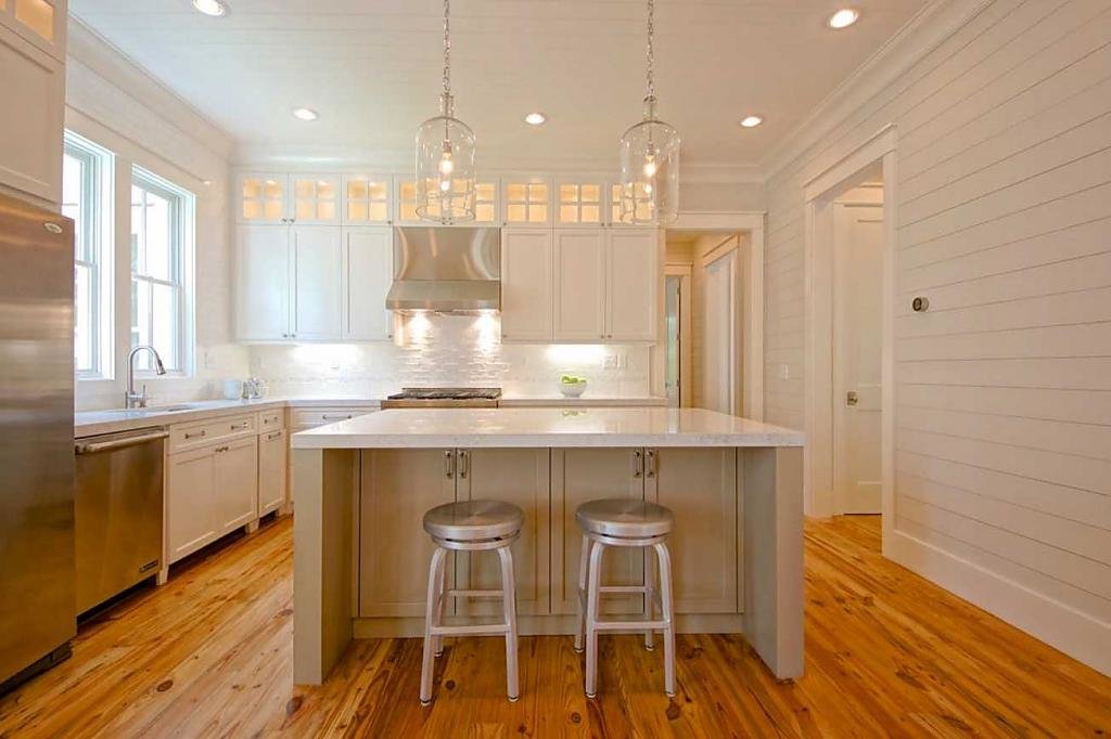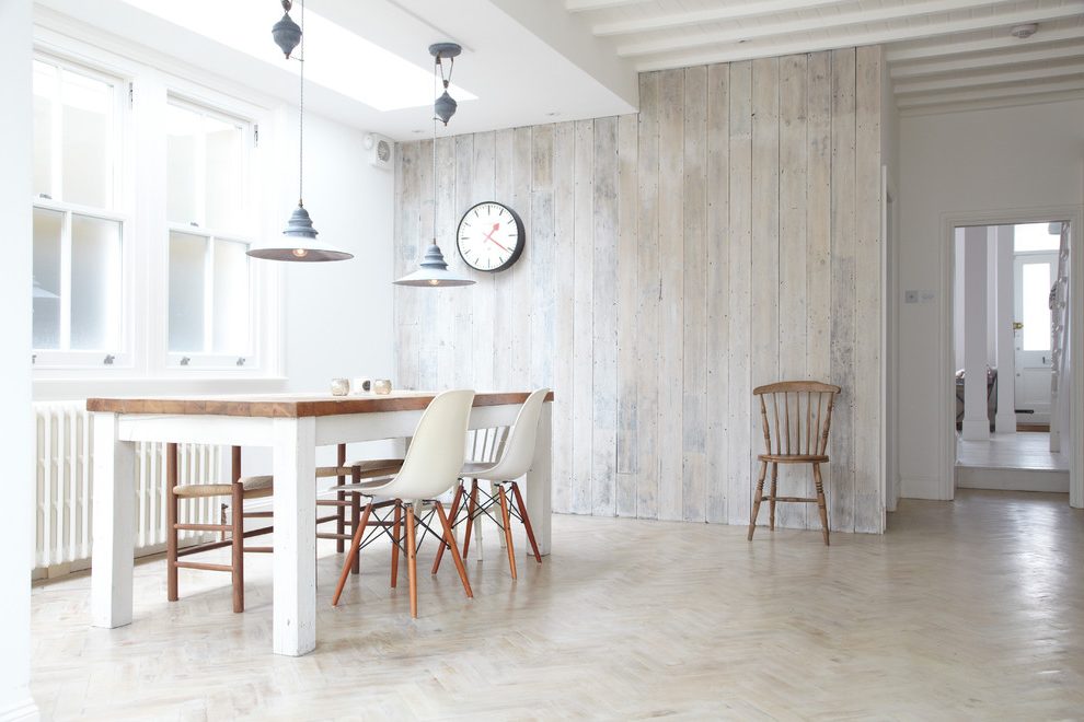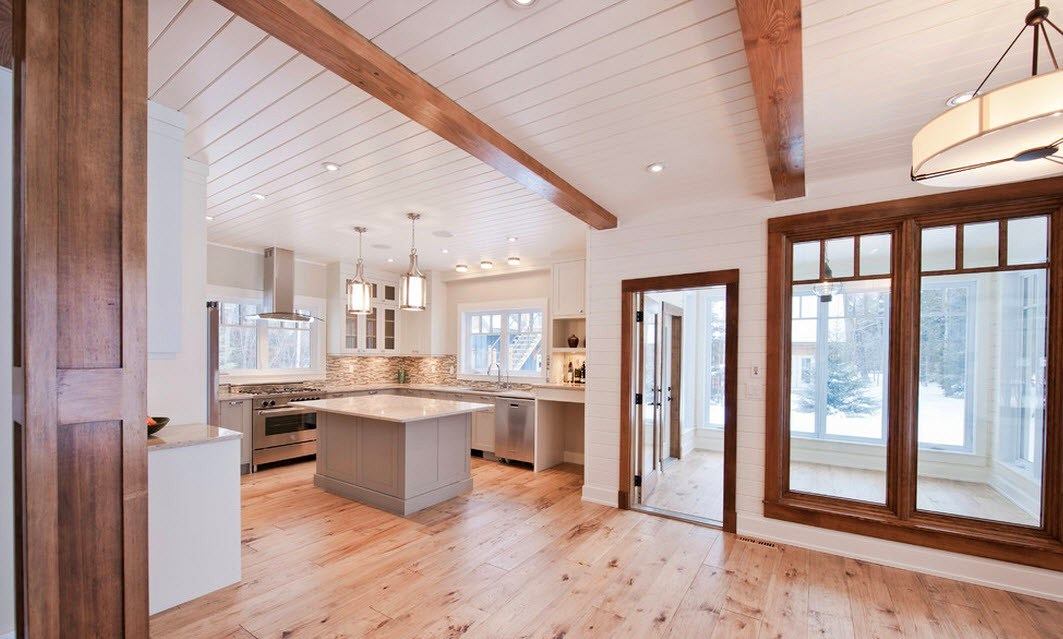 Le Reiki en bois naturel peut recouvrir complètement la cuisine ou la salle à manger - du sol au plafond - en ajoutant un accent riche.