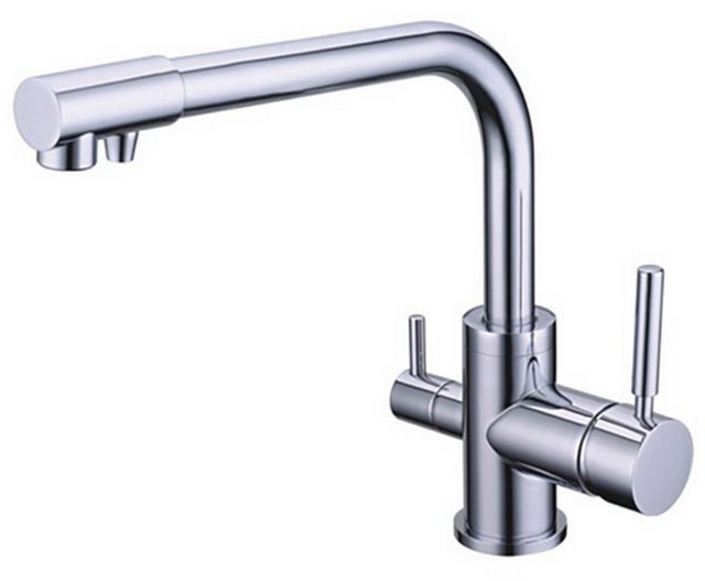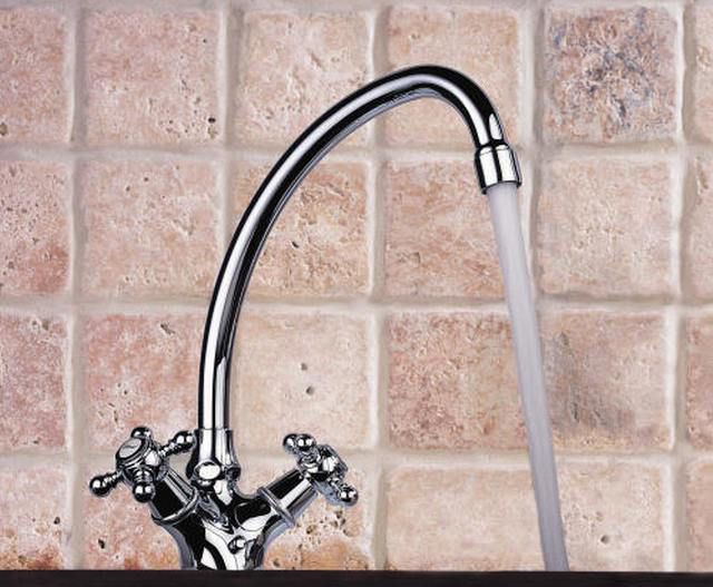 - Deux soupapes. La version classique des robinets, qui est utilisée non seulement pour la cuisine, mais aussi pour le bain. Il se distingue par la présence de deux régulateurs d'eau: un pour le chaud et un pour le froid. Ces robinets de cuisine peuvent être installés pour créer un style rétro dans la pièce. Sur les marchés, il existe différentes formes et couleurs du produit.
