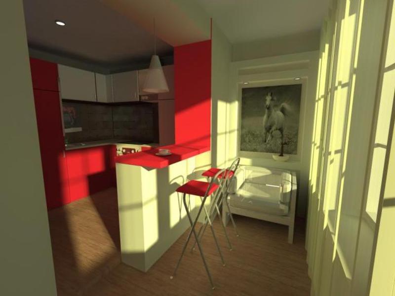 La kitchenette sur le balcon après avoir combiné les pièces prend très peu de place