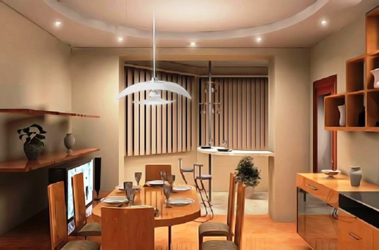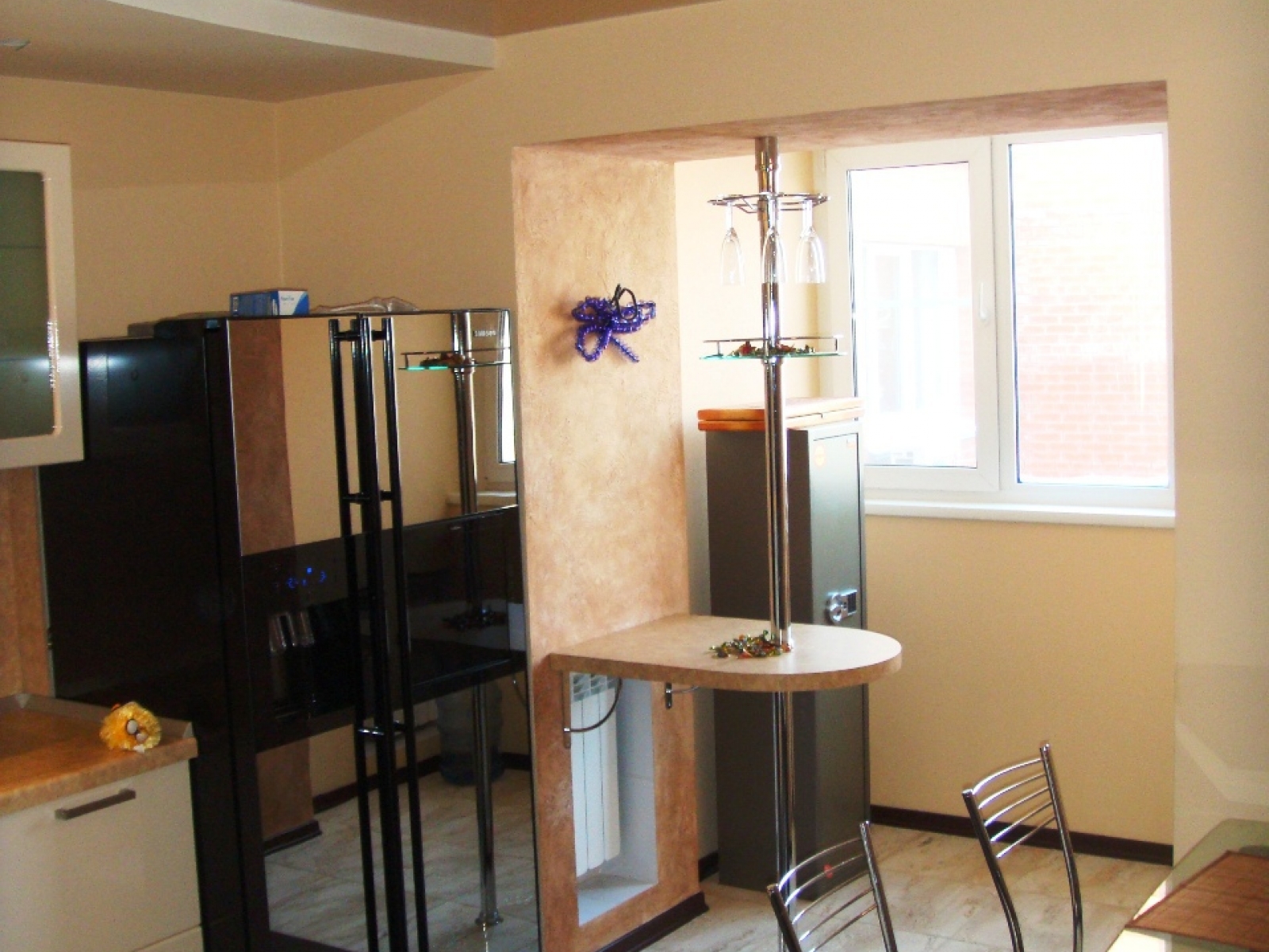 Une excellente solution serait d'installer une barre sur le cavalier. Cette option permettra d'économiser du temps, de l'argent et des mètres carrés dans la salle à manger. Seules la porte et la fenêtre devront être démontées. Le comptoir de bar est une excellente alternative à une table à manger ordinaire. Son plan de travail peut être en pierre naturelle, en bois.