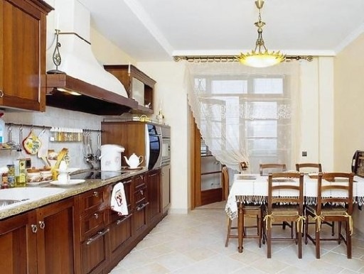 | Provence | La direction française est généralement au goût des personnes délicates et douces. Il se caractérise par l'utilisation de meubles légèrement vieillis, d'imprimés floraux dans les textiles et de rideaux d'air. La palette de couleurs d'une cuisine avec balcon doit être principalement claire. Les petits détails lumineux sont autorisés. |