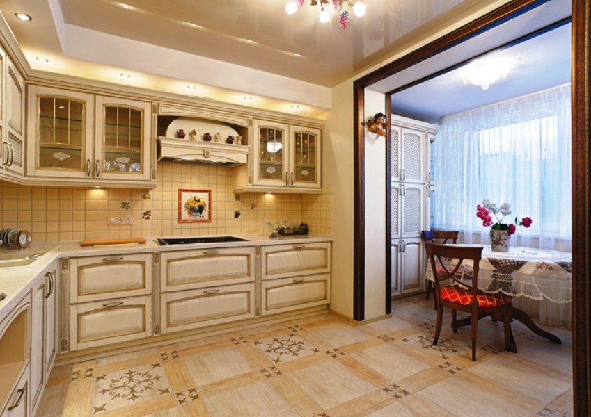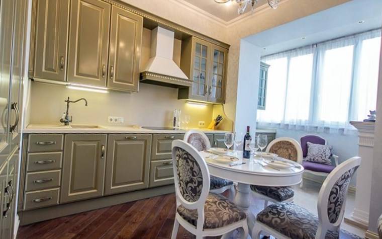 La cuisine, combinée avec un balcon, dans le style classique ressemble à une plate-forme avec de beaux meubles sculptés