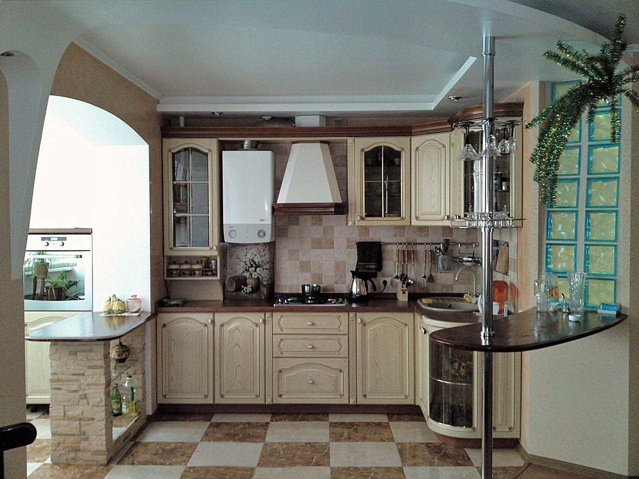 - Le matériau de fabrication. La cuisine est constamment humide, très humide. La température de l'air peut changer fréquemment. L'ensemble de cuisine doit être résistant à toutes ces manifestations externes. Économiser sur les meubles n'en vaut pas la peine. Il vaut mieux acheter des produits coûteux de haute qualité.Ils serviront pendant des décennies. Le matériau idéal est le bois naturel. Cependant, il existe des alternatives moins chères: panneaux de particules, MDF. Les plans de travail sont mieux choisis parmi la pierre naturelle et artificielle. Ils résistent aux dommages mécaniques, s'intègrent parfaitement dans toutes les directions de style.