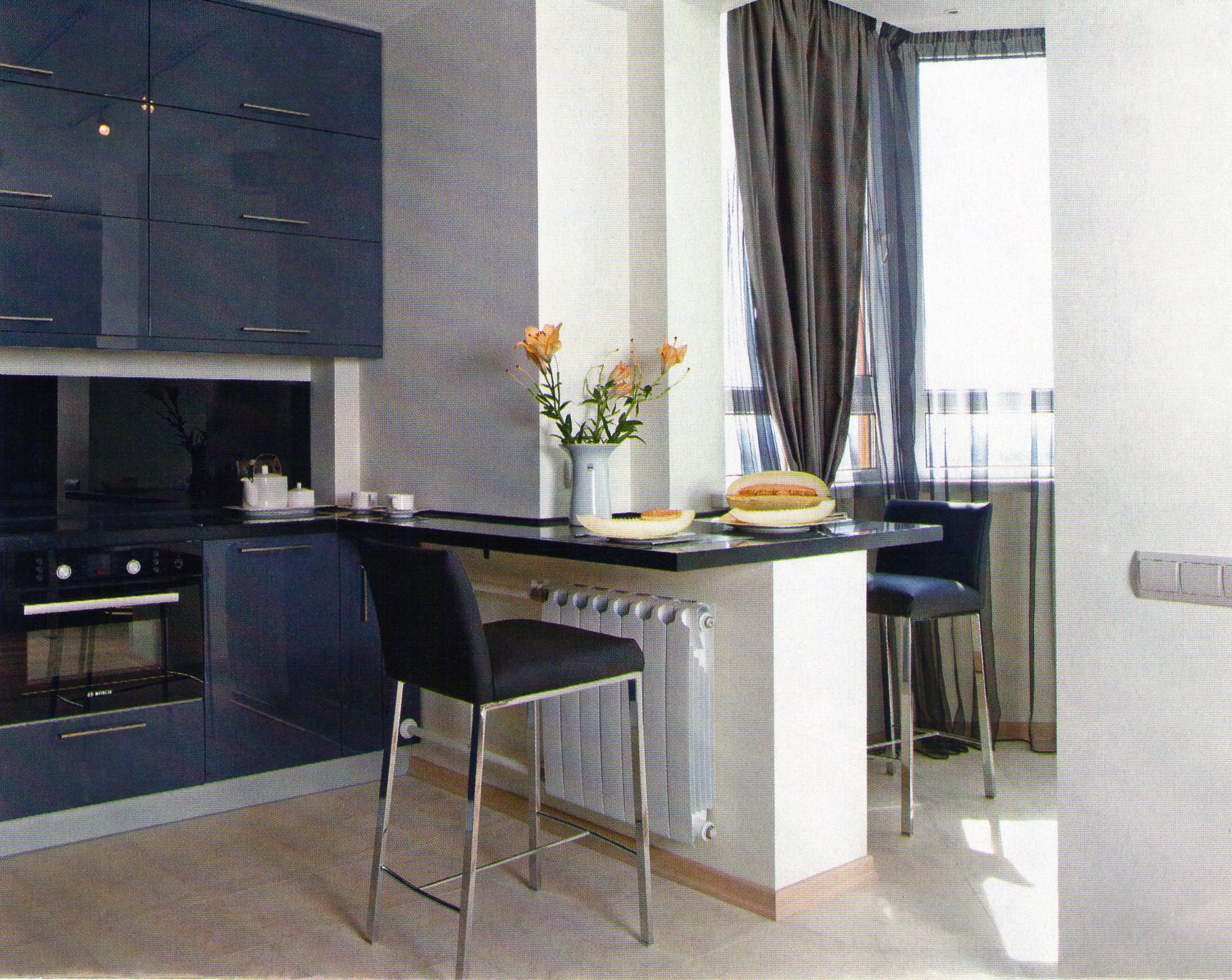 L'intérieur de la cuisine avec un comptoir de bar dans le style loft après avoir combiné avec un balcon