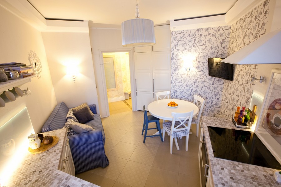 - n'utilisez pas de peintures murales dans une petite pièce; l'accent lumineux au-dessus de la table dans le style général avec un tablier dans la zone de travail serait mieux.