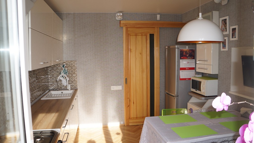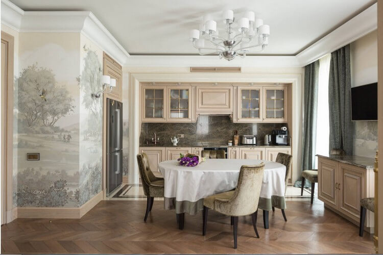 - Style classique - convient à tous les types de pièces, généralement ce sont des tons clairs de papier peint uni qui conviendront à tout type de sol et de mobilier. Un accent lumineux dans ce style est généralement fait avec le tablier d'origine sur la surface de travail et la table à manger.