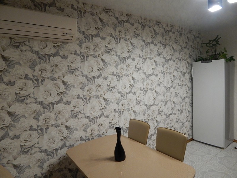Avec du papier peint, vous pouvez décorer la cuisine dans n'importe quel style, il vous suffit de connaître la mesure. Par exemple, à l'intérieur d'un style moderne, il suffit de coller un mur ou même une petite partie de celui-ci