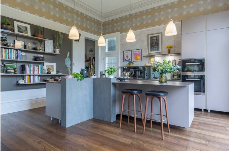 Le papier peint à rayures verticales soulève visuellement le plafond de la cuisine
