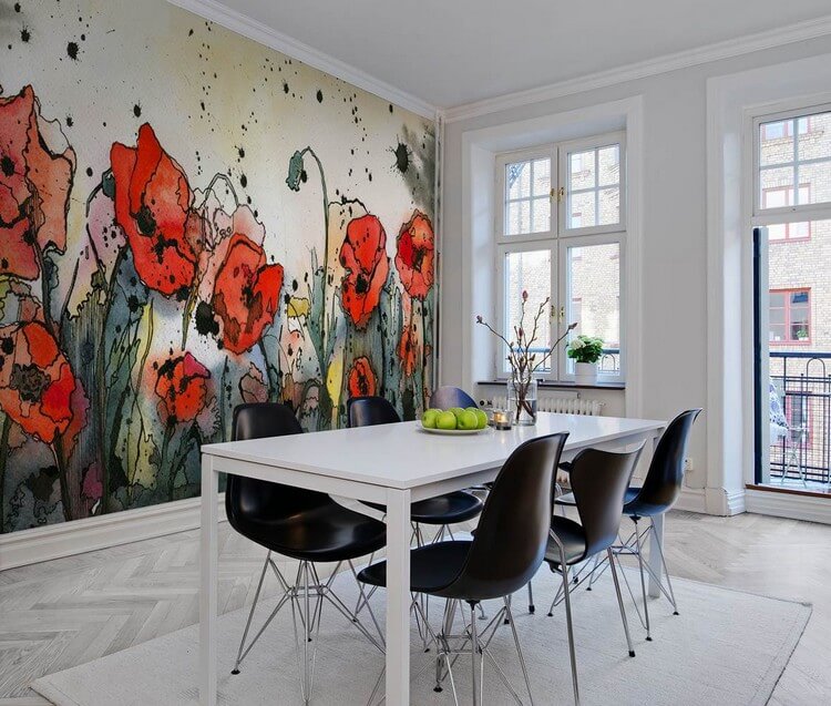 - lors du choix d'une grande image, il est préférable de coller sur un tel mur avec l'un des plus grands murs, où, en règle générale, il y aura une table à manger;