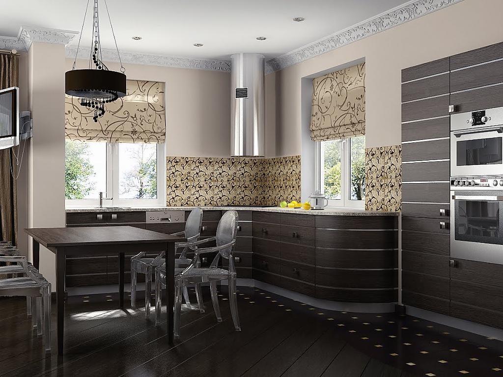 Le contraste d'un tel intérieur, un éclairage supplémentaire dans des niches (ou l'organisation de l'éclairage avec des volets roulants décrite précédemment), des motifs complexes et ornés. Tout cela peut être réalisé dans la vraie vie dans la cuisine des rêves (contes de fées).