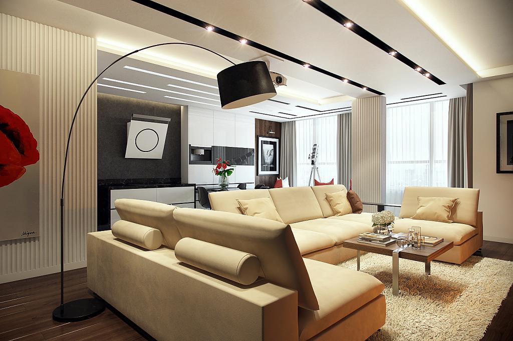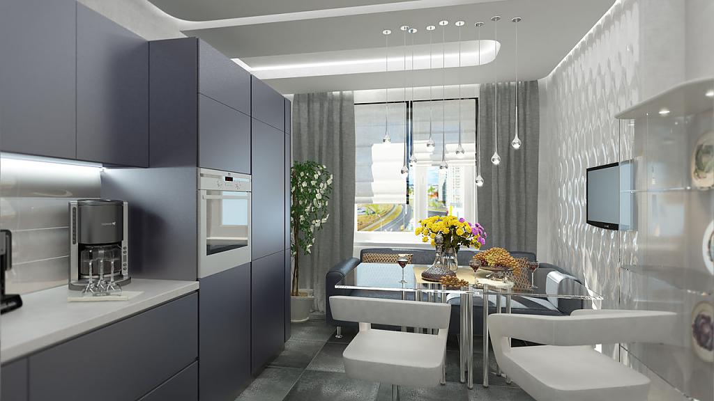 En mettant en œuvre une telle idée de conception dans votre cuisine à domicile, vous pouvez agrandir visuellement la taille, donner de la légèreté à la pièce et en même temps de la rigueur.