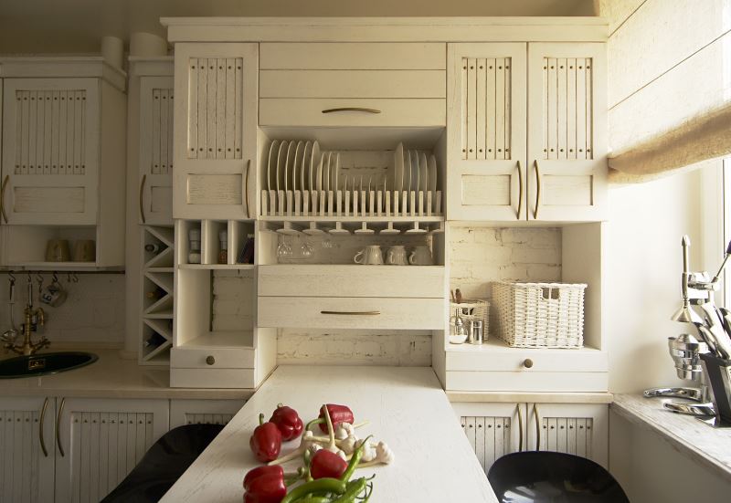 Cuisine moderne avec des étagères sur le mur pour les assiettes et des étagères ouvertes pour les grands plats