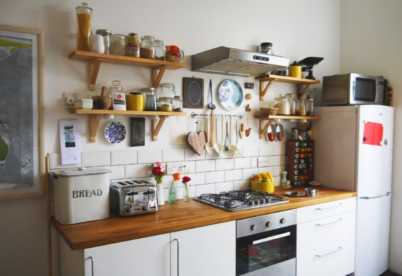 Les étagères ouvertes pour les ustensiles de cuisine agissent comme décoration et pratiques à utiliser