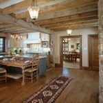 Il est préférable d'utiliser un parquet en bois. Les planches ont intentionnellement un aspect vieilli. En haut ils sont vernis. Parfois, des nuances mates sont utilisées.Si vous utilisez un tapis, il doit avoir l'air vieux.