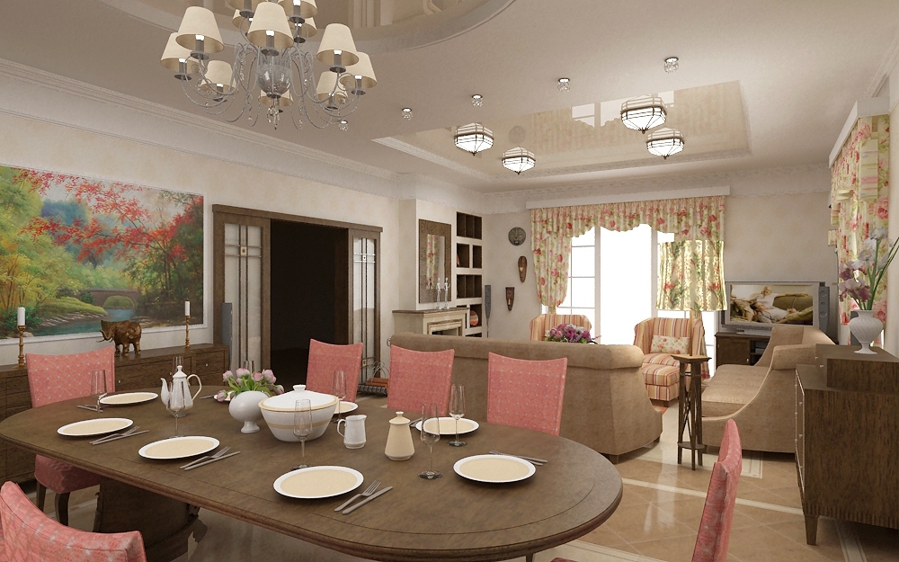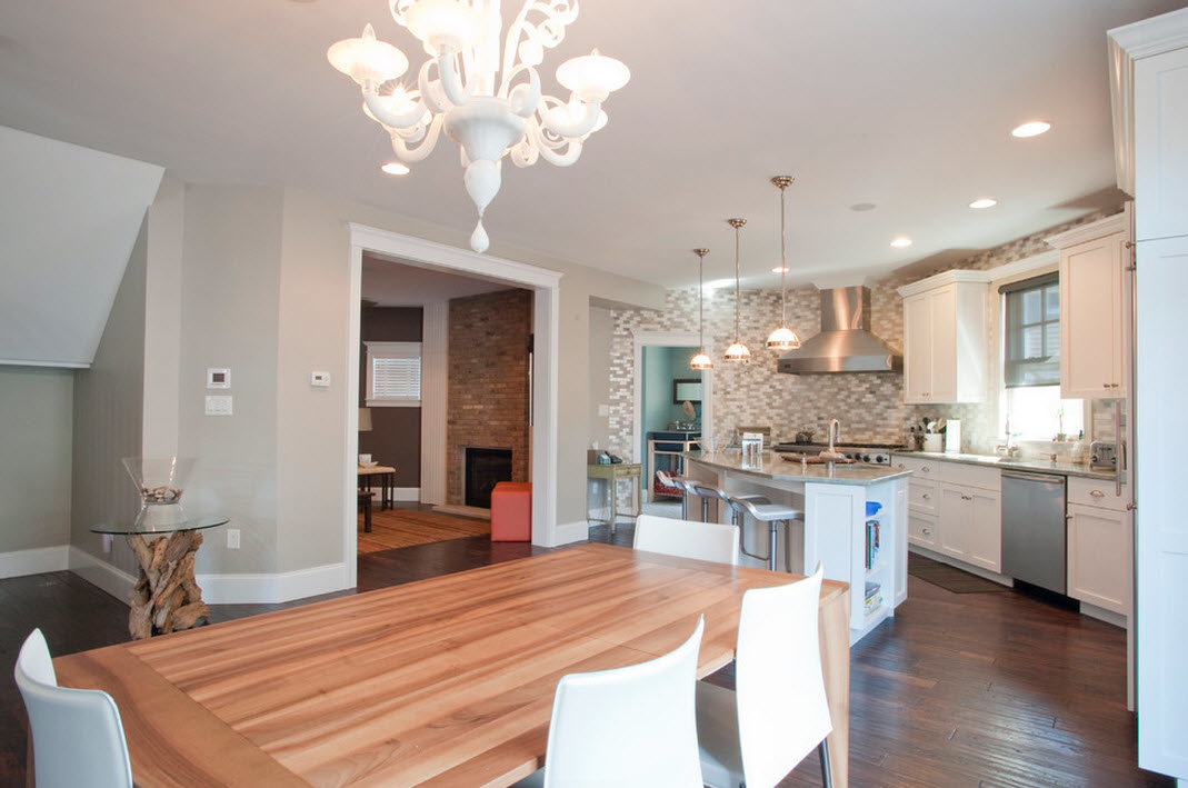 La source lumineuse de la pièce combinée est un ensemble de plafonniers. Il peut également s'agir d'un lampadaire fixé par une chaîne originale à la base. Vous pouvez vous «arracher» en choisissant un plafond, la conception la plus impensable qui surprendra agréablement les visiteurs dans une salle pour le dîner ou le déjeuner.