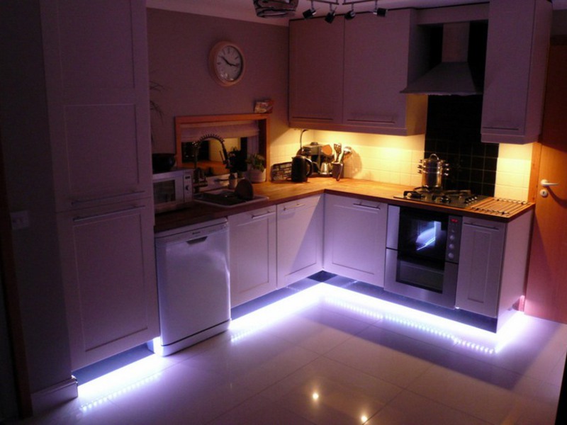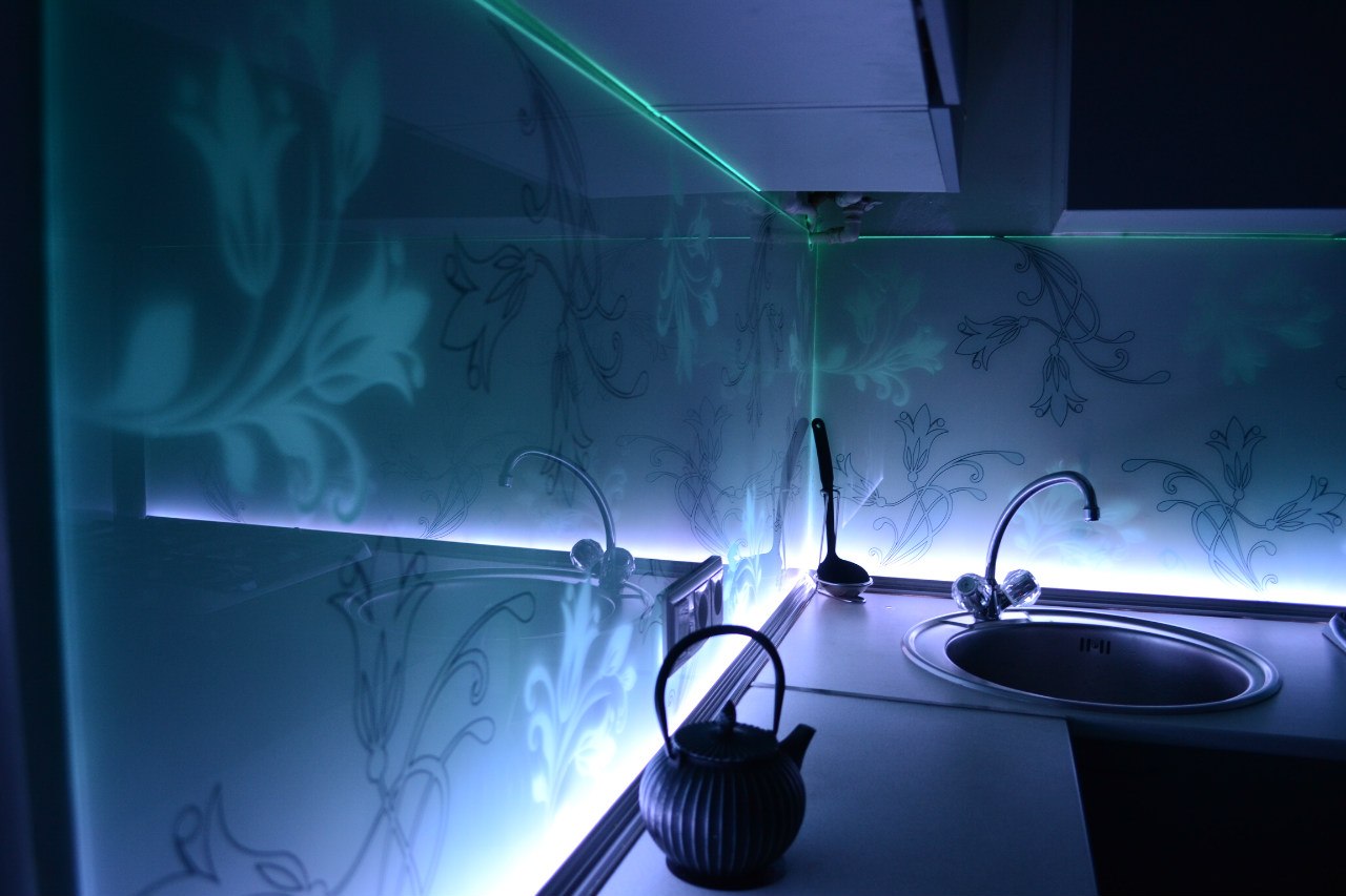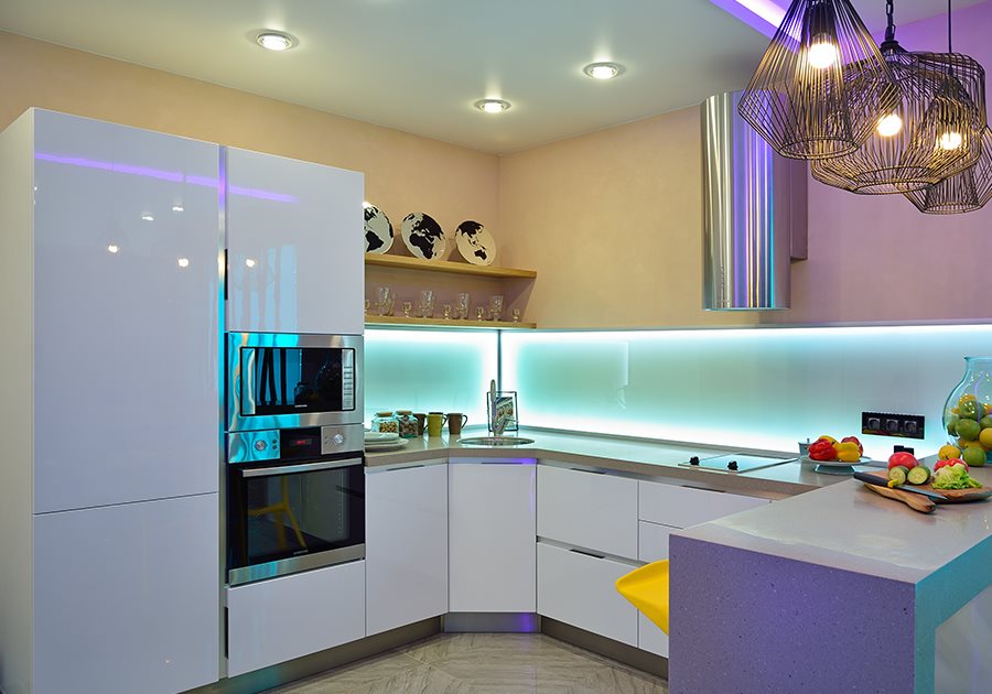 En plus d'installer des éléments qui éclairent la salle à manger et les zones de travail de la cuisine, vous pouvez décorer une niche, des étagères avec des lampes, mettre en évidence certains objets que votre cœur aime et combiner des surfaces planes avec une bande LED: l'espace sous le dessus de table et les bords des armoires. Cela donnera à la pièce un look festif. Le «ruban» multicolore des LED est magnifique.