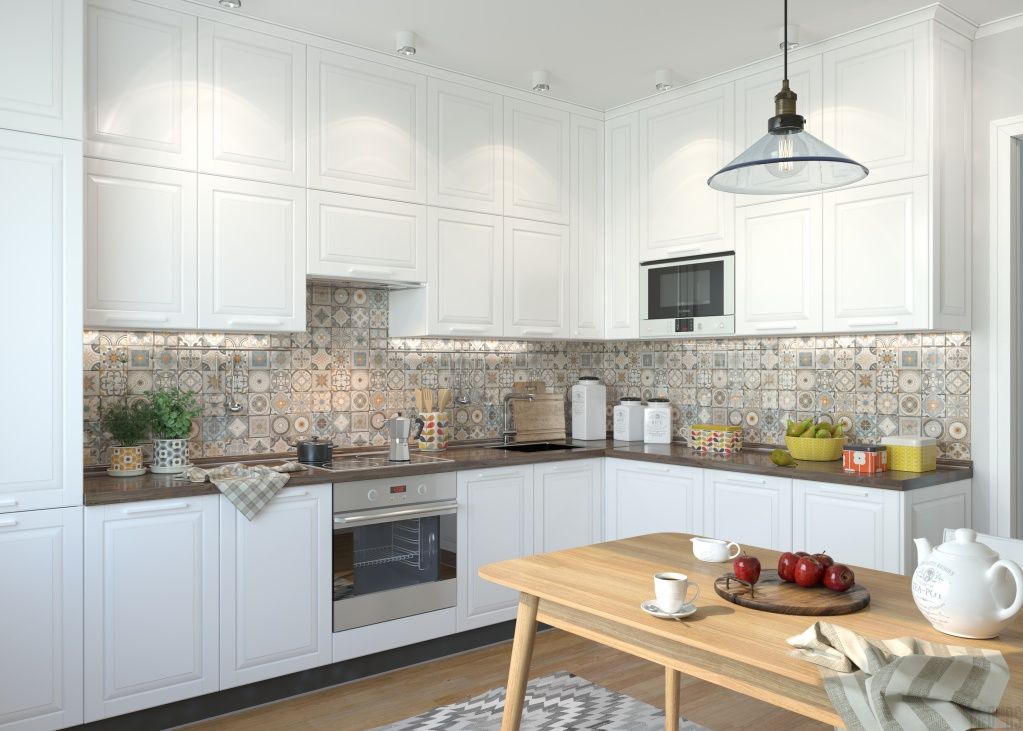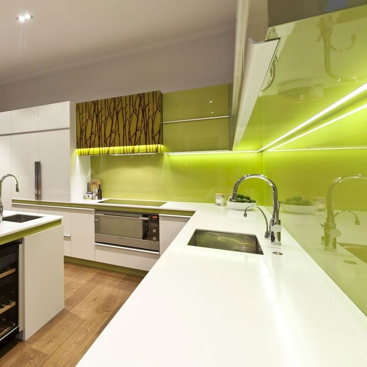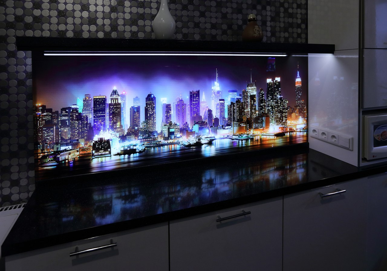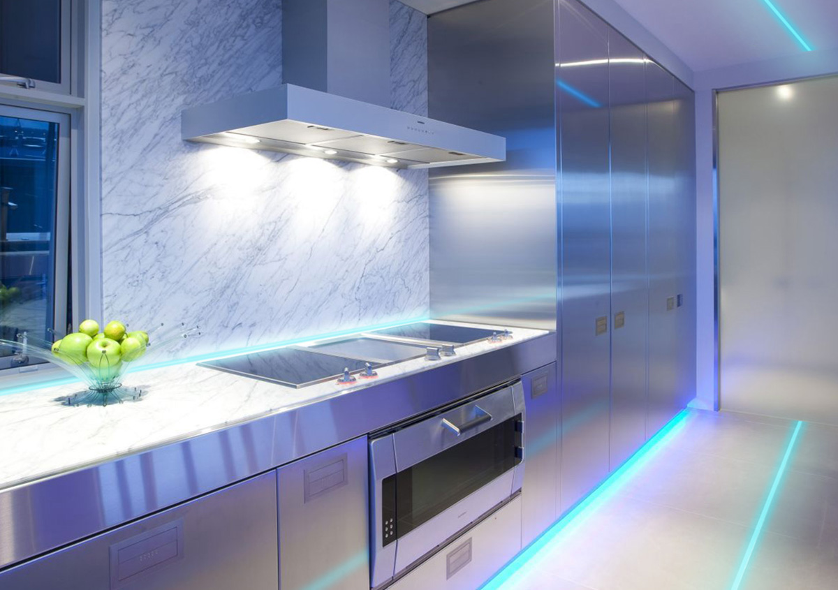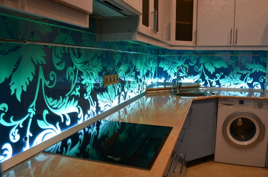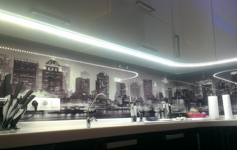 Pour la surface de la table de découpe, cette option convient: des lampes luminescentes intégrées au plafond, ainsi qu'une lampe intégrée dans le mur, qui illumine avec une lumière, une teinte fluorescente et se reflète discrètement sur la table de découpe, au-dessus du poêle, au-dessus du «tablier».