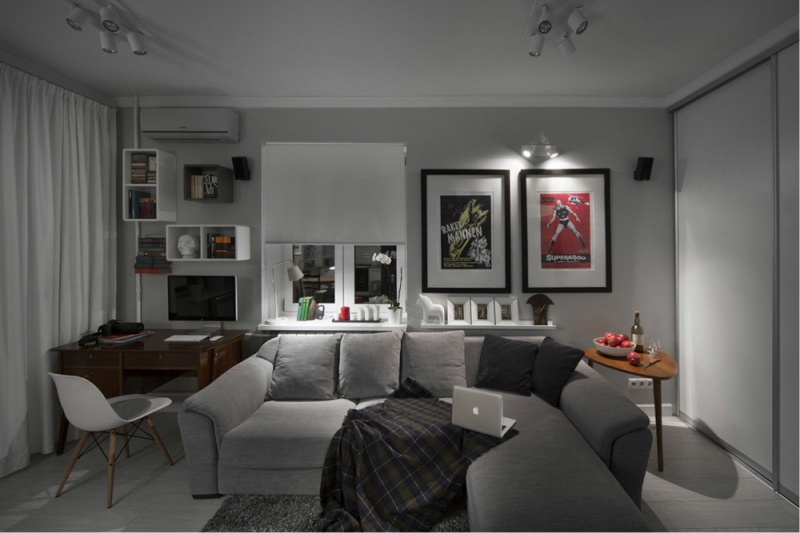 Ceux qui ont un «studio» (environ 20 m²), lorsque la salle d'entrée est combinée avec la cuisine, les concepteurs conseillent de se rappeler le point important: lorsque les plats sont préparés et dînés, la lumière doit être plus lumineuse que dans la zone de loisirs. Puisque la cuisine est l'endroit où ils travaillent, ils cuisinent, l'éclairage doit être suffisamment lumineux, mais un tel rétro-éclairage sera ennuyeux sur le canapé.