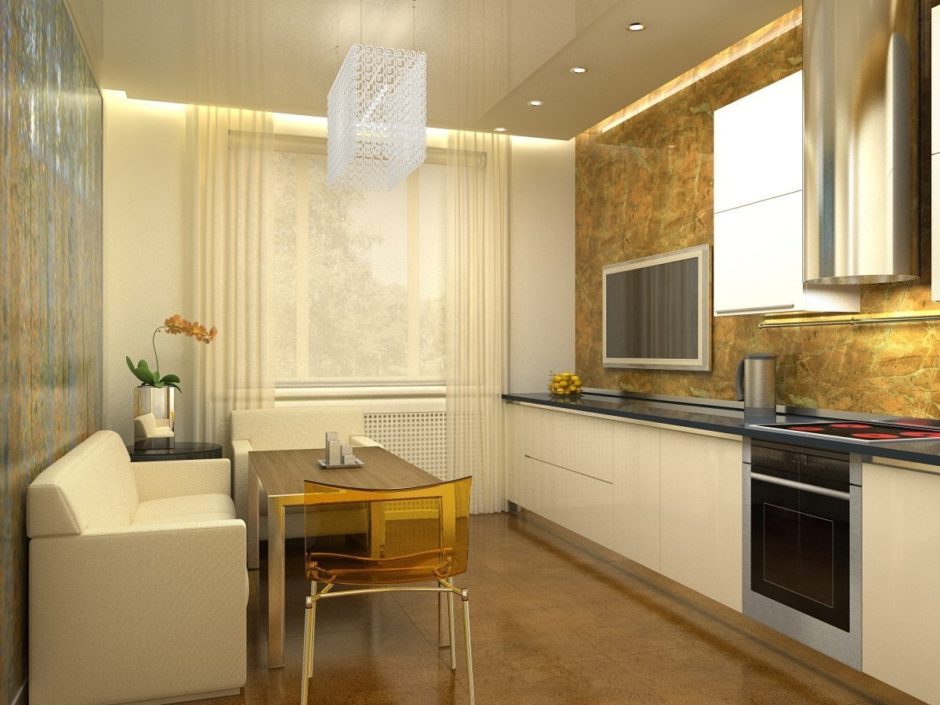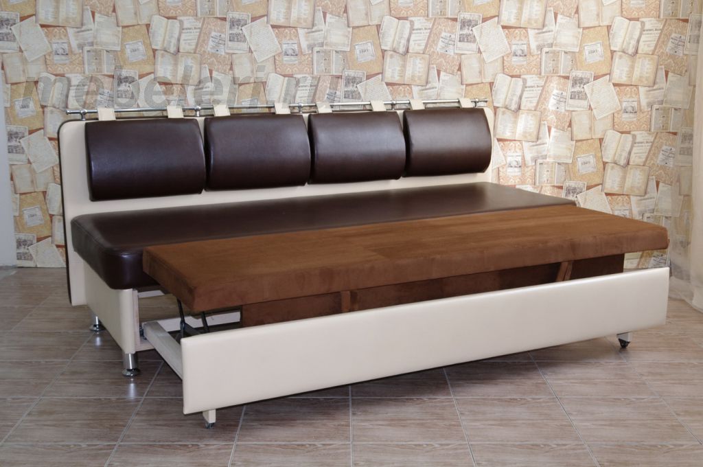 Le canapé dans la cuisine avec une couchette étroite et étroite en ligne droite est particulièrement pratique pour mettre dans un appartement du type "Khrouchtchev" ou un studio. Chaque centimètre d'espace libre sera utilisé aux fins prévues. De plus, des boîtes de rangement supplémentaires aideront à réduire le nombre de choses, tandis qu'une couchette pleine apparaîtra.