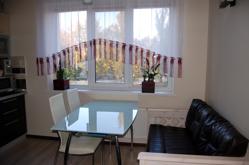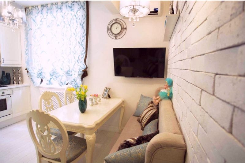 Un petit canapé étroit dans la cuisine vous permet d'accueillir confortablement et d'économiser de l'espace dans l'espace d'un petit appartement. Ces meubles ont d'autres avantages: