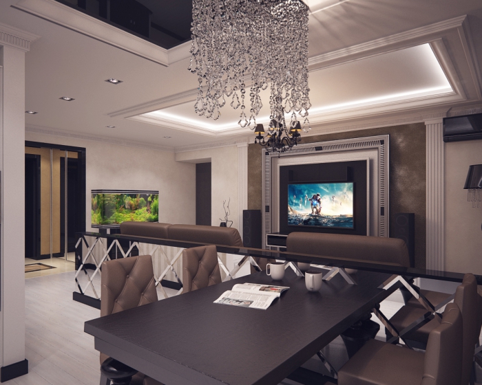 Le plafond peut avoir différents niveaux, poutres, inserts de miroir et formes complexes