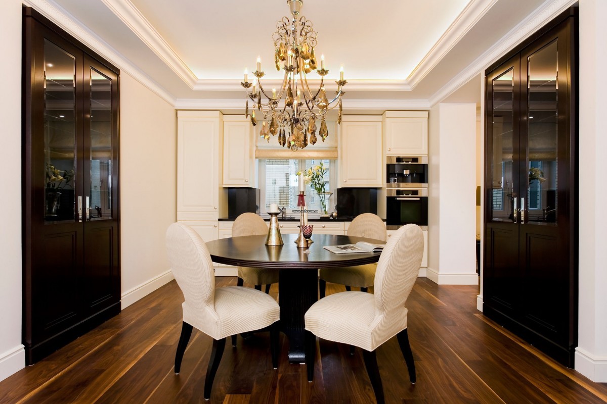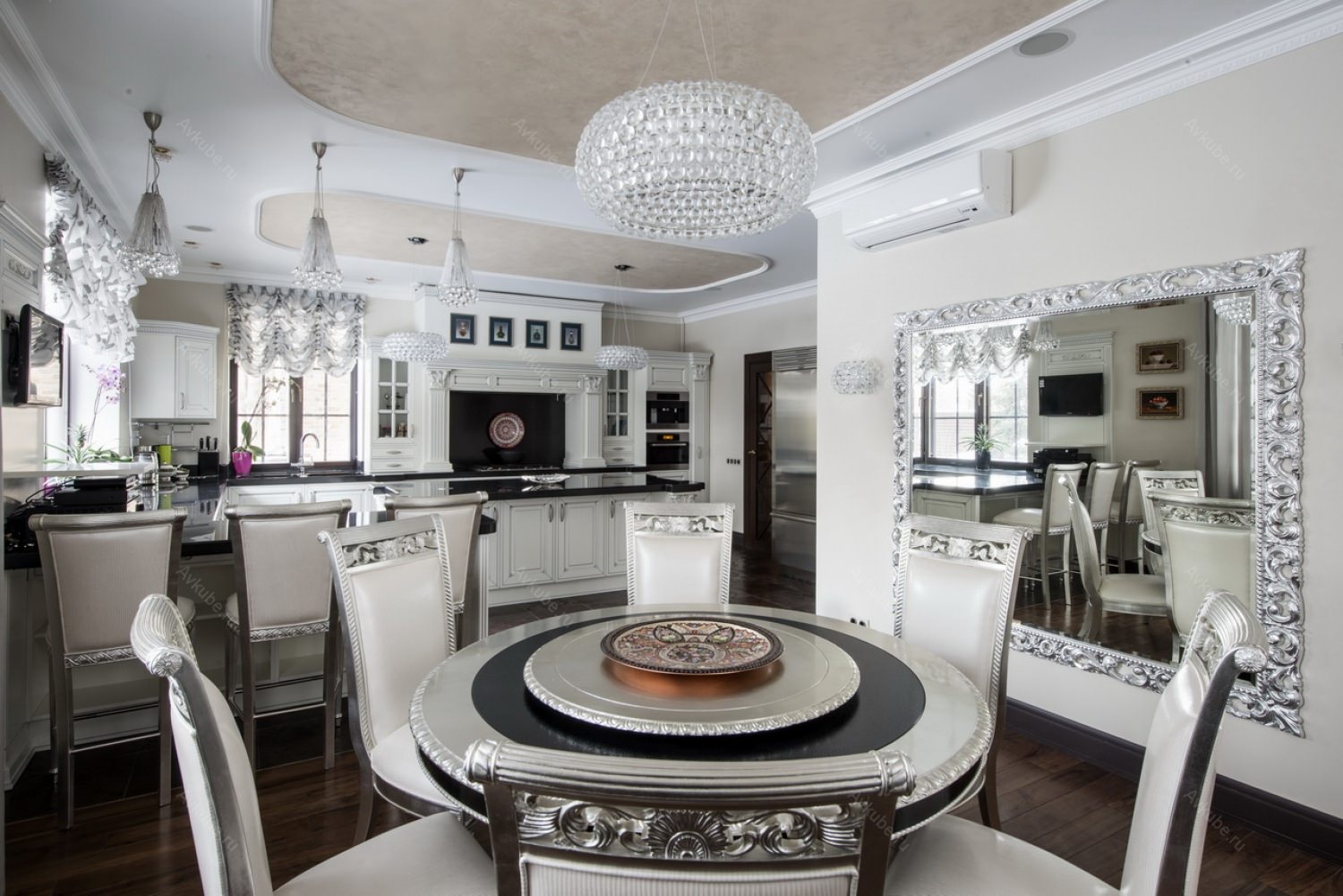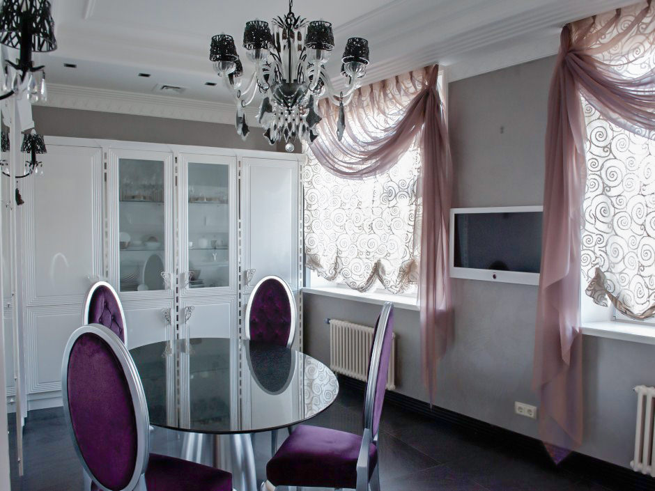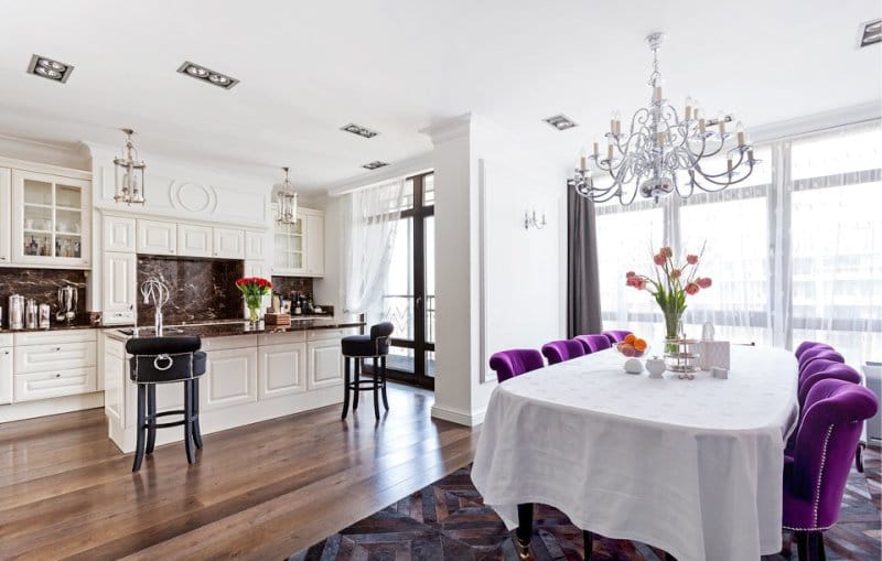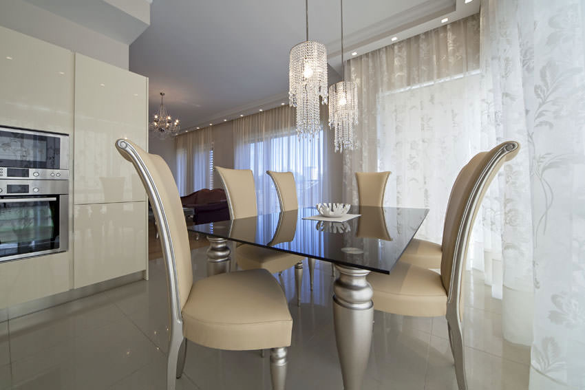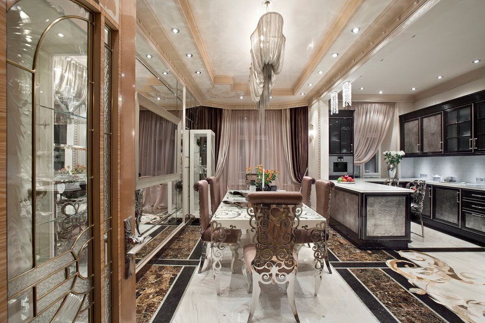 Pour concevoir la salle à manger, vous pouvez choisir un canapé et des chaises élégantes à dossier haut et allongé. La tapisserie d'ameublement de sofa devrait être velours, velours ou tissu avec fil brillant.