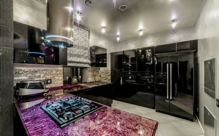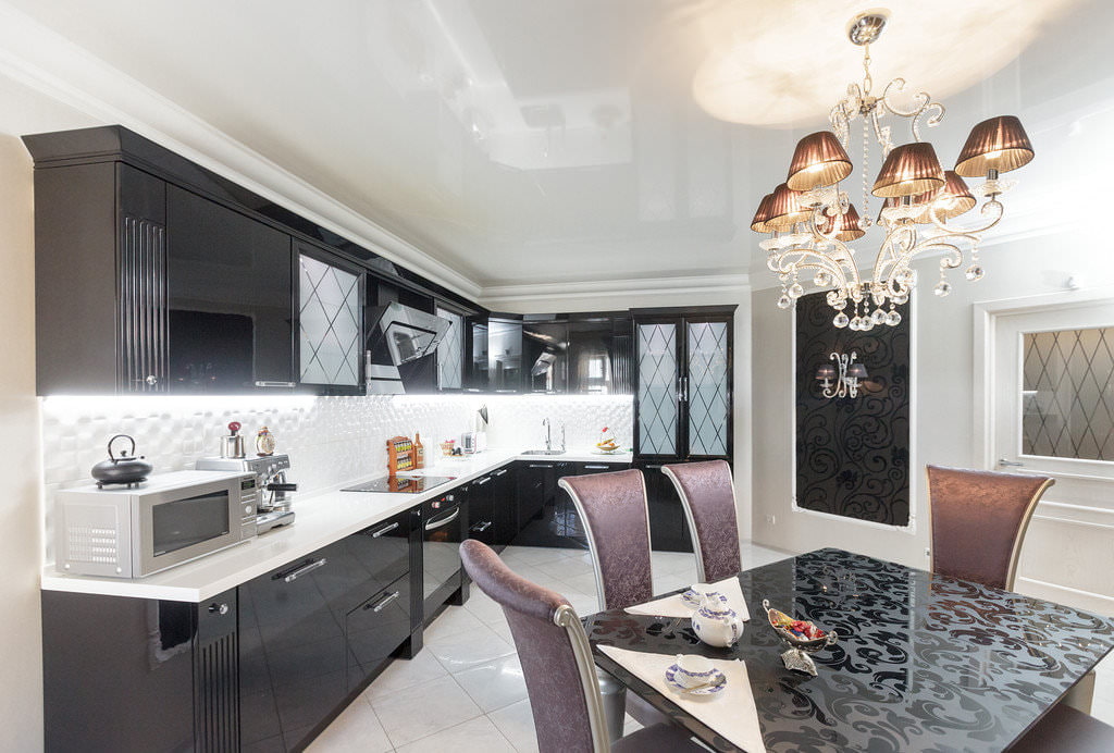Un ensemble de cuisine en bois, verre et métal est la meilleure option. Vous pouvez utiliser des meubles en MDF, mais ils doivent être chers et élégants.