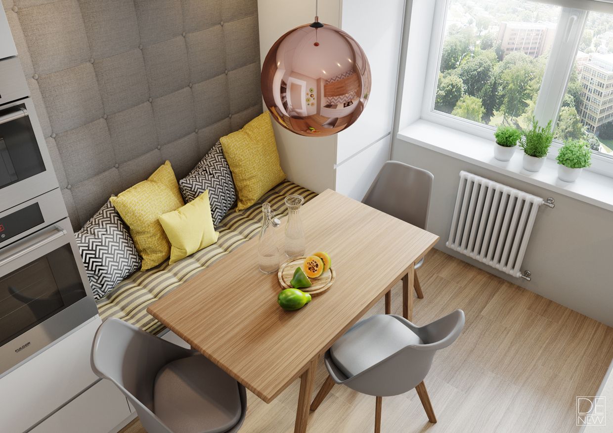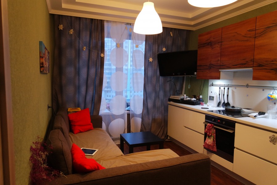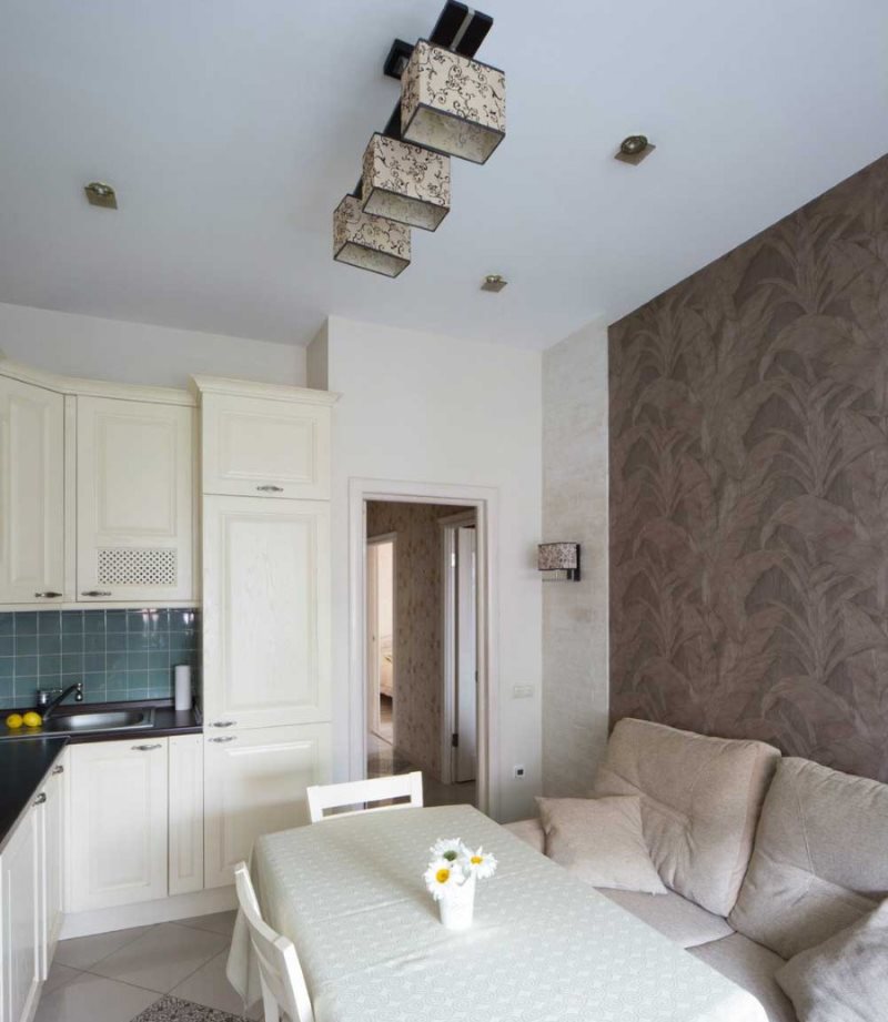 La première chose à faire est de diviser la pièce en zones sur le plan, à savoir, nous allouons de l'espace pour la cuisine et calculons les mètres restants. Habituellement, il reste environ 4 à 5 mètres carrés. Sur les restes, il est nécessaire d'installer un coin salon confortable avec un canapé.