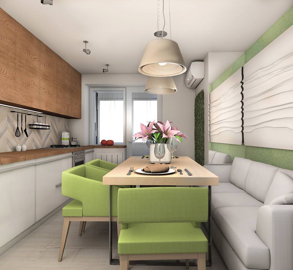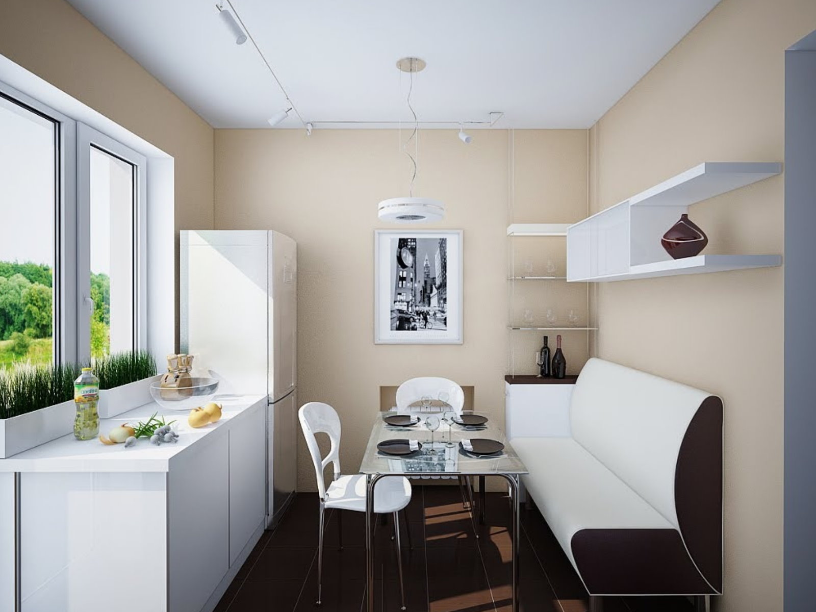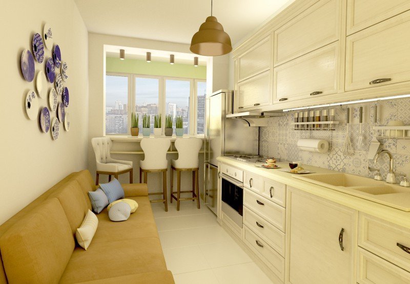 En combinant la cuisine-salon avec un balcon, vous pouvez obtenir quelques mètres carrés, ce qui est suffisant pour y aménager la cuisine et la salle à manger.