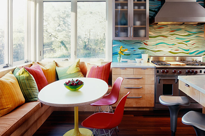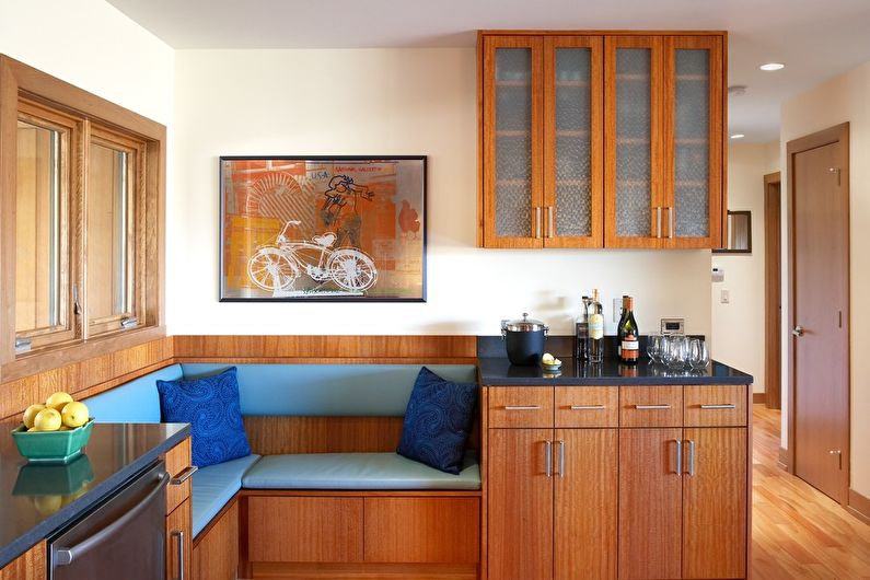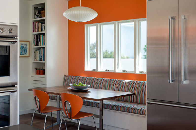 Un canapé droit peut être idéal pour une cuisine carrée sans balcon, si vous le placez le long de la fenêtre et placez une table à manger à proximité