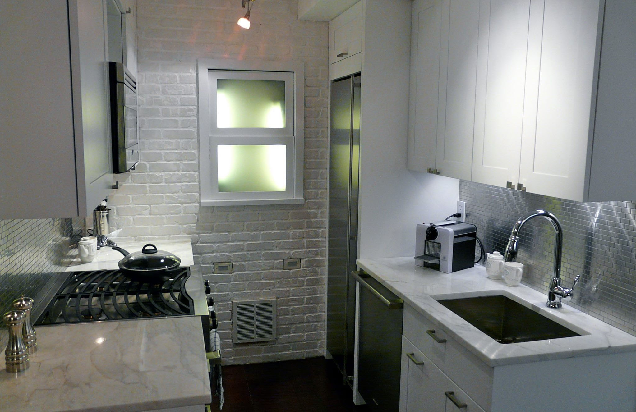 Parmi les qualités positives: l'option la plus simple et la moins chère, la pièce semble spacieuse et lumineuse. Les inconvénients sont les inconvénients de l'utilisation dans une longue pièce (3-4 mètres) et une petite surface de travail dans une courte.