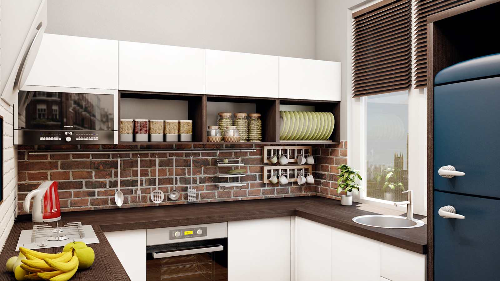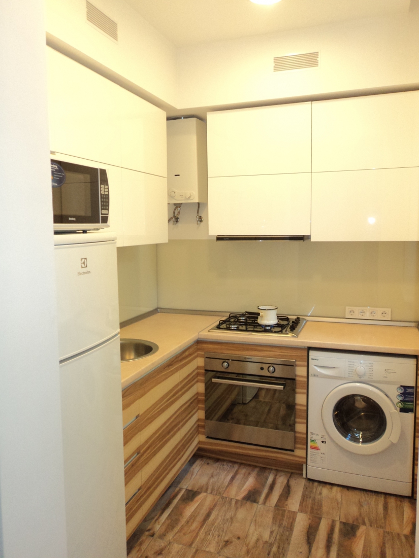 Il s'agit de l'option la plus abordable pour la disponibilité des appareils électroménagers. Le reste, disent les experts, doit être caché dans des casiers. La charnière doit être faite au plafond. Cela économisera de l'espace et empêchera la poussière et la graisse de s'accumuler au-dessus. Il a l'air moderne, en particulier avec les portes à charnières hautes avec fermetures.