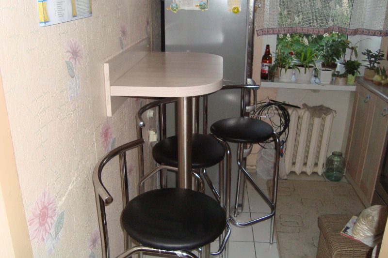 En option, vous pouvez recommander le comptoir descendant adjacent au rebord de la fenêtre. En temps normal, il est omis et n'affecte pas le travail dans la cuisine. Pour le déjeuner ou le travail, elle est élevée.