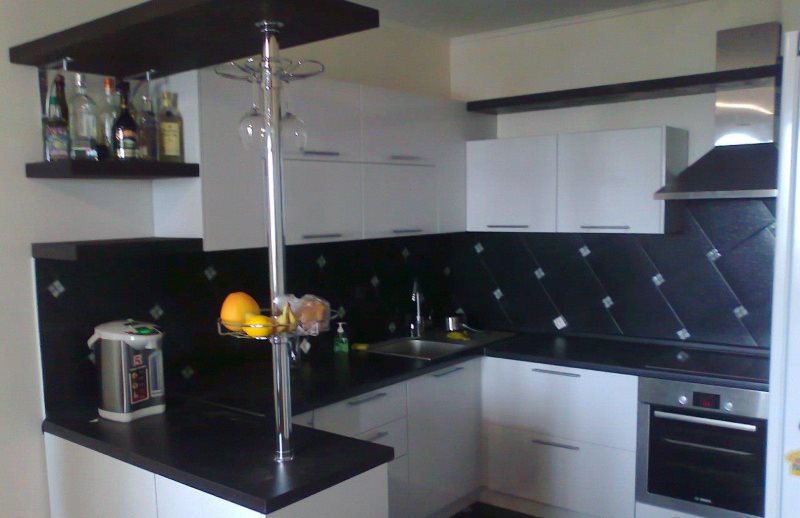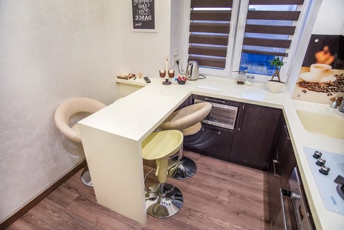 - Avec une surface de travail. Il n'y a pas assez d'espace pour cuisiner - nous complétons la barre (à un angle, parallèle ou perpendiculaire, même en continuation).