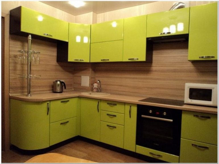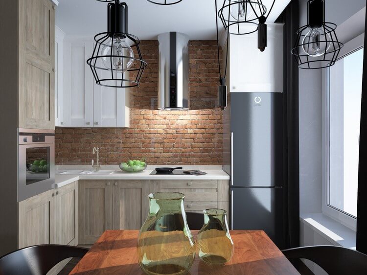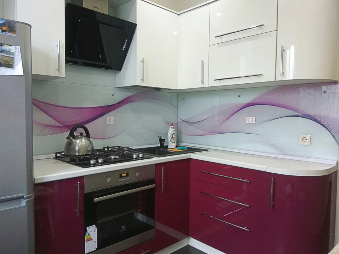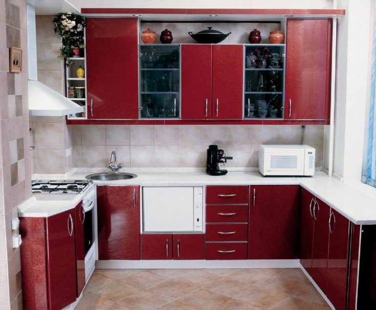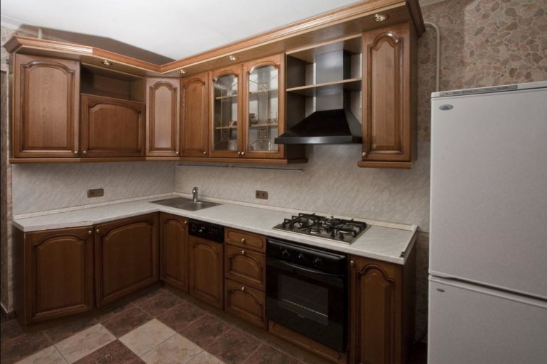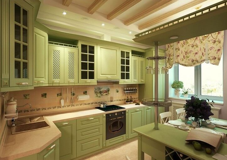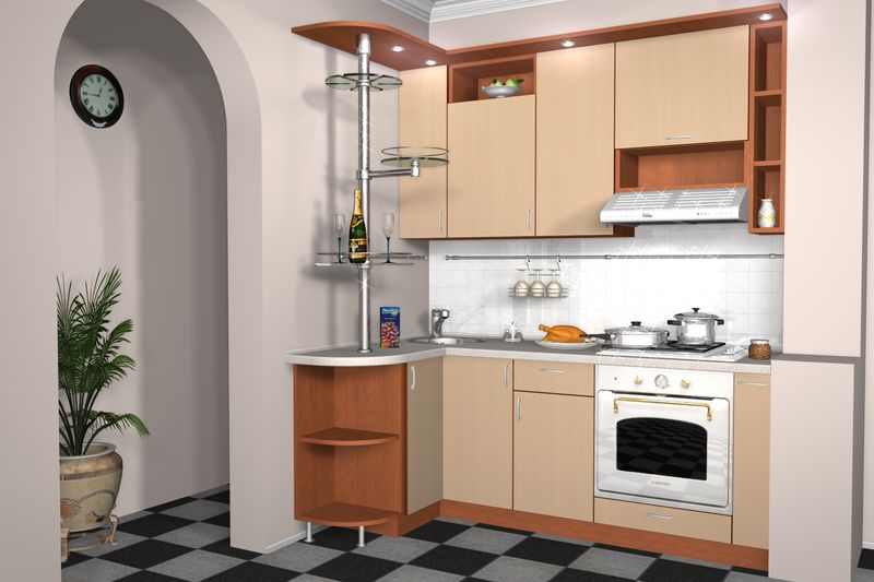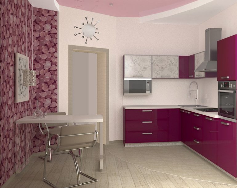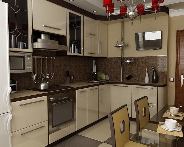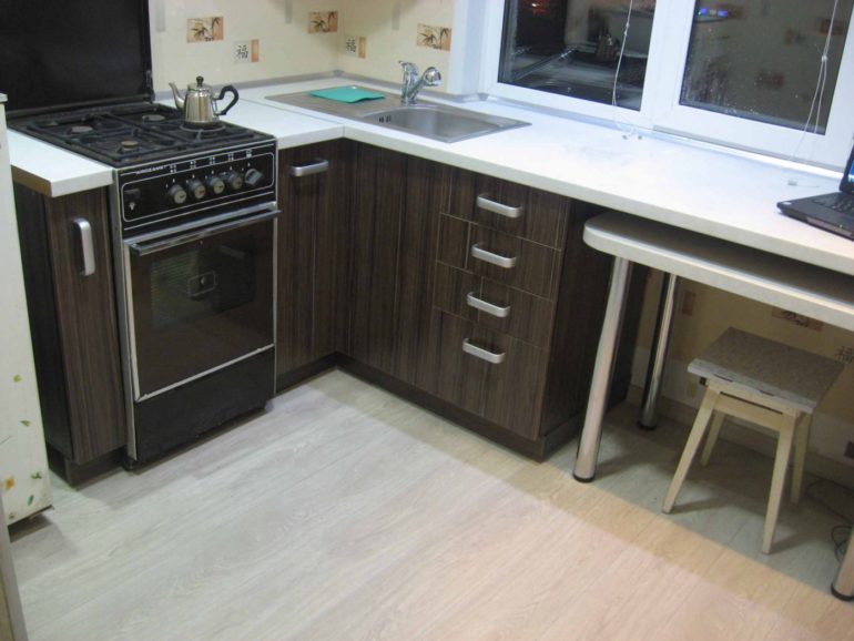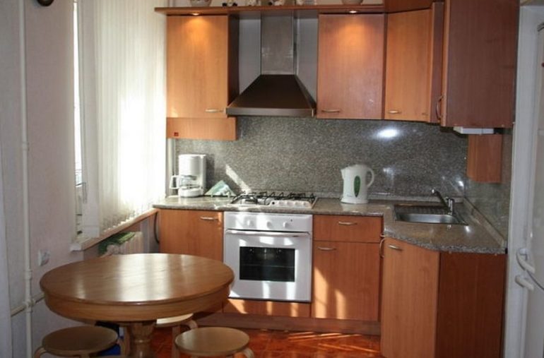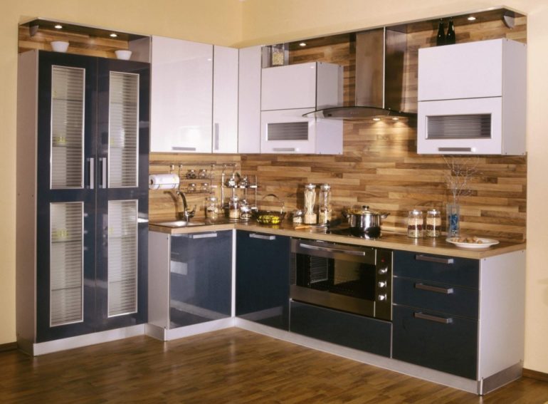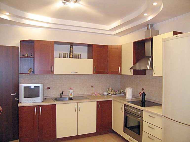 - L'aspect volumineux d'une telle cuisine dans un petit espace.Se déplacer le long du «triangle de travail» ne laisse pas d'espace libre dans la cuisine, surtout si deux personnes l'utilisent.